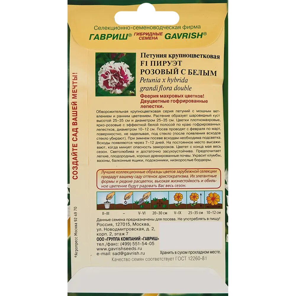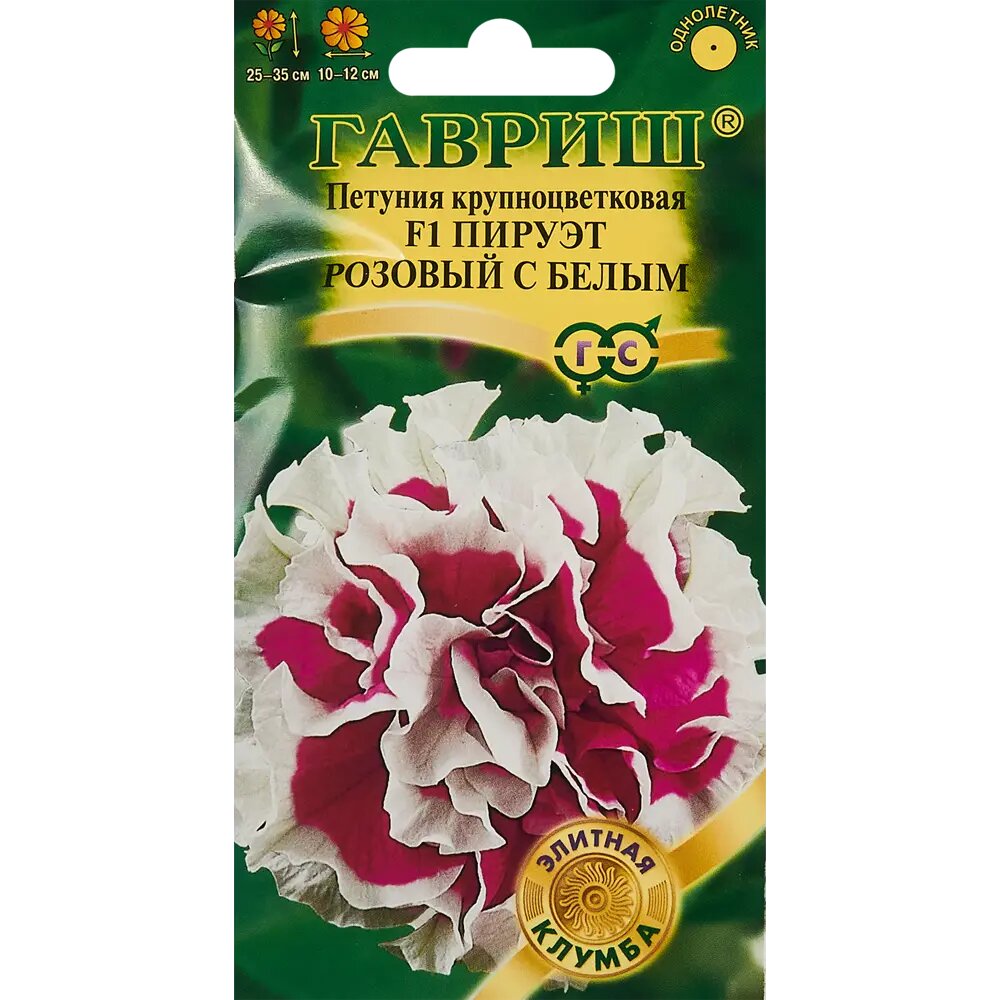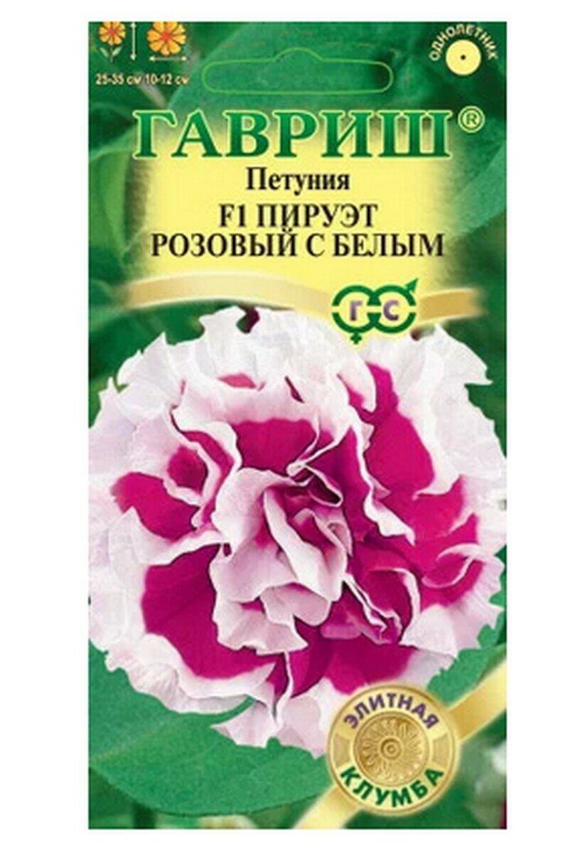 **Семена цветов Гавриш петуния Пируэт ** — однолетнее растение. Оно вырастает до 35 см в высоту. Цветы махровые, окраска — розовый с белым, от центра к волнистому краю расходятся темные прожилки. Может выращиваться в доме в балконном ящике, на клумбе в парке или на дачном участке. При составлении композиций следует размещать петунию на переднем плане, чтобы более высокие растения не загораживали ей свет.