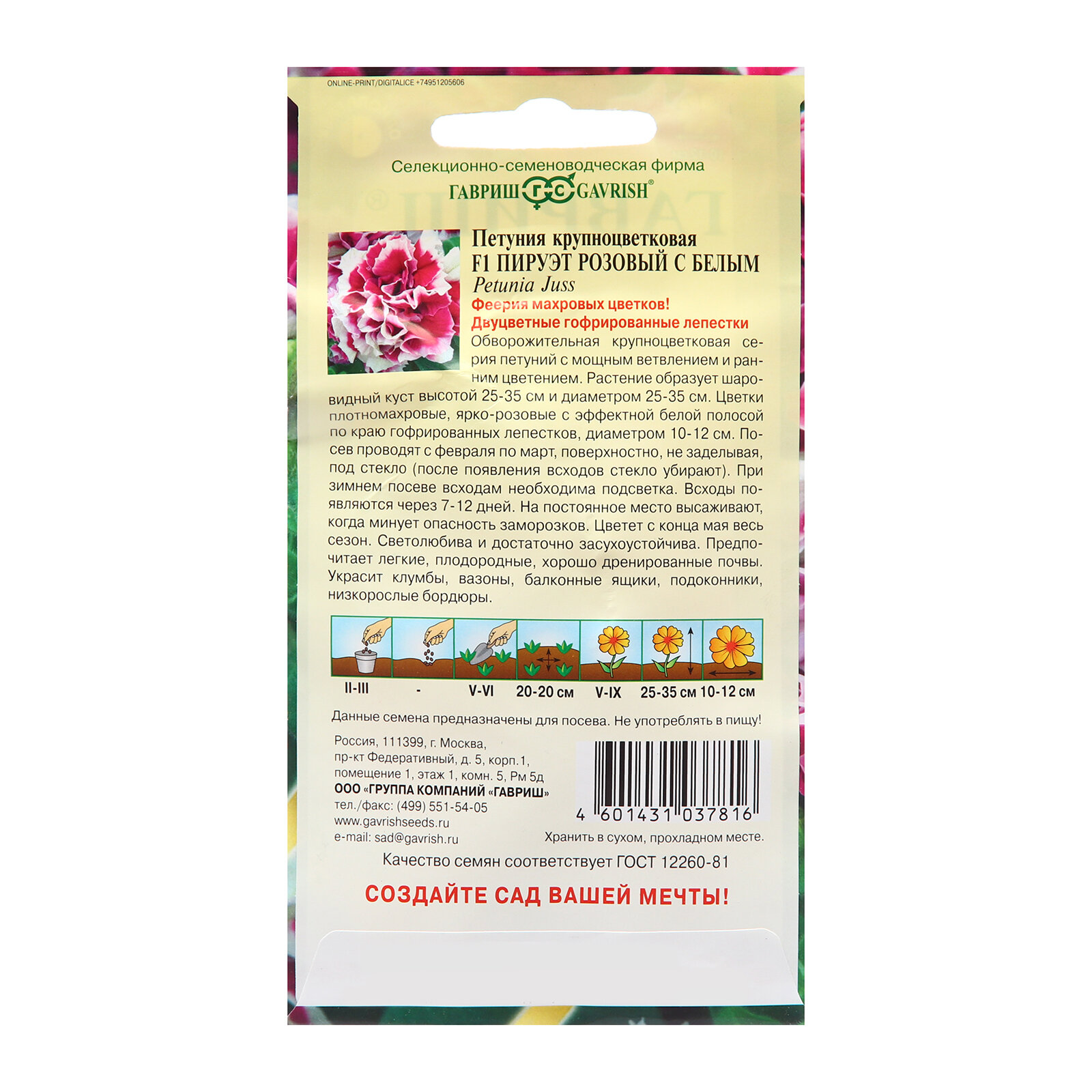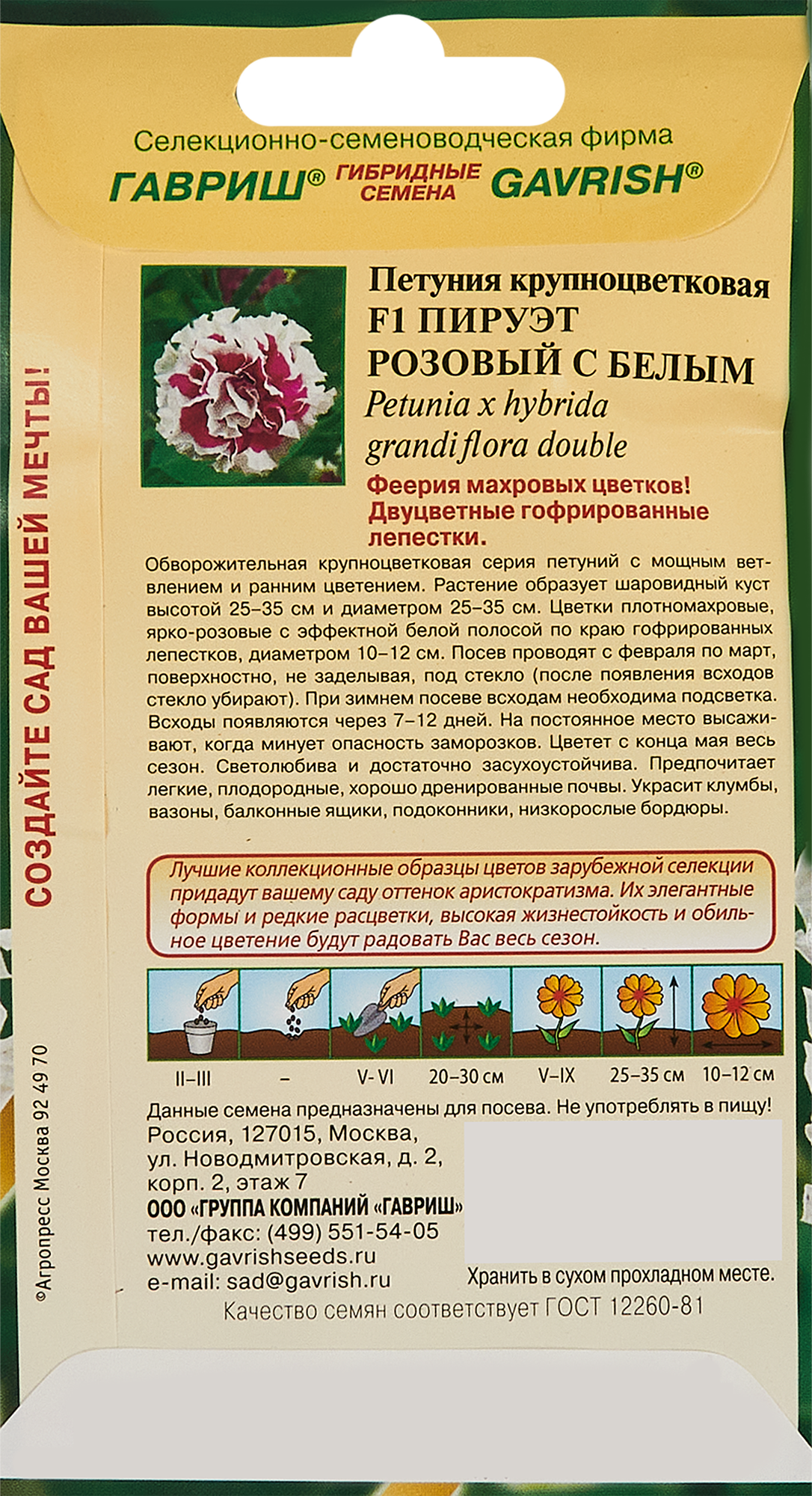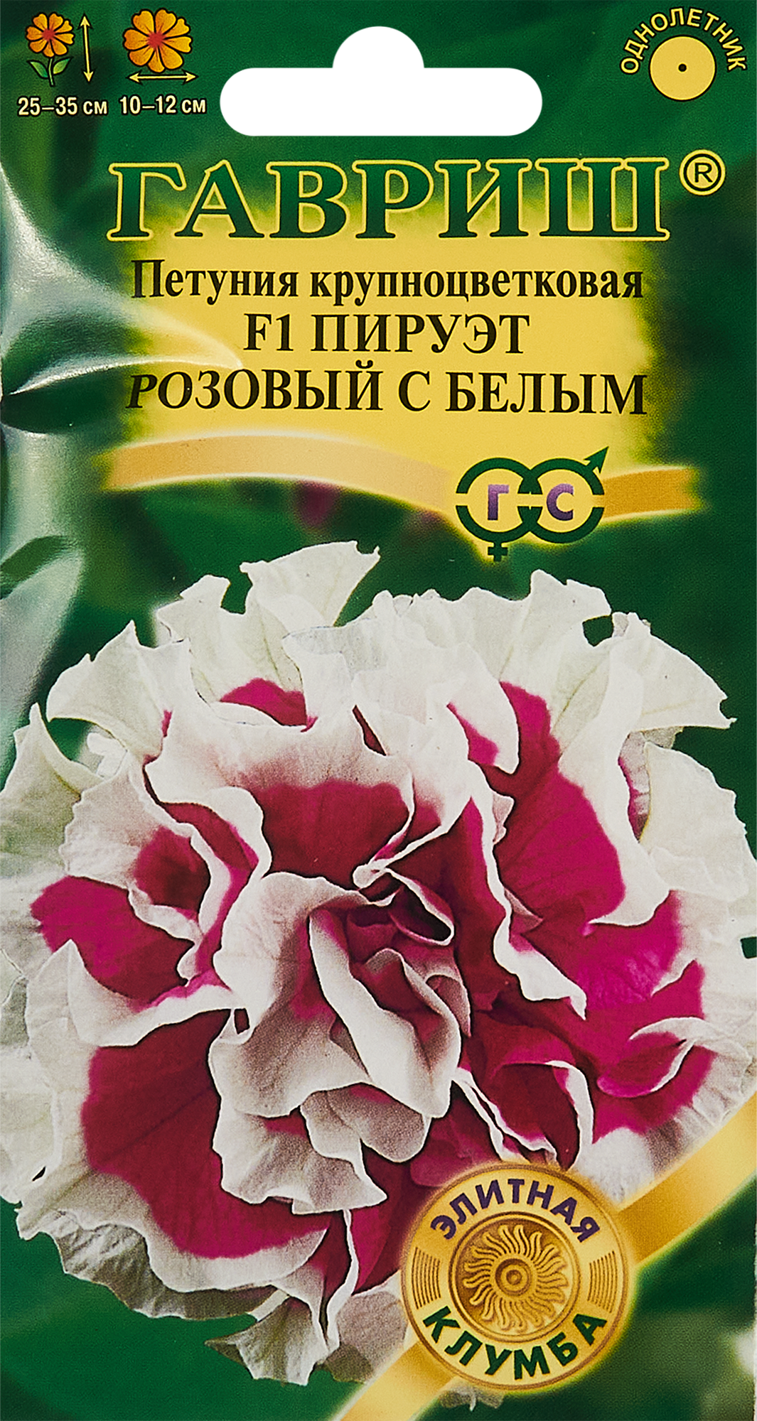 **Семена цветов Гавриш петуния Пируэт ** — однолетнее растение. Оно вырастает до 35 см в высоту. Цветы махровые, окраска — розовый с белым, от центра к волнистому краю расходятся темные прожилки. Может выращиваться в доме в балконном ящике, на клумбе в парке или на дачном участке. При составлении композиций следует размещать петунию на переднем плане, чтобы более высокие растения не загораживали ей свет.