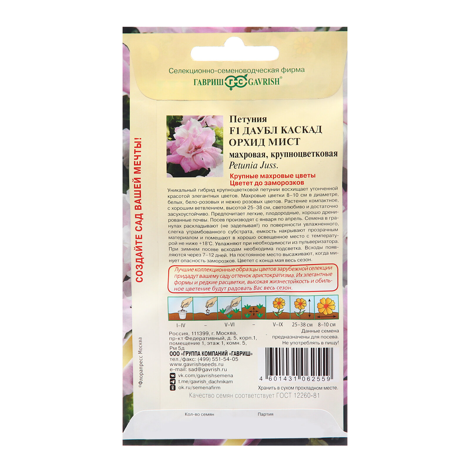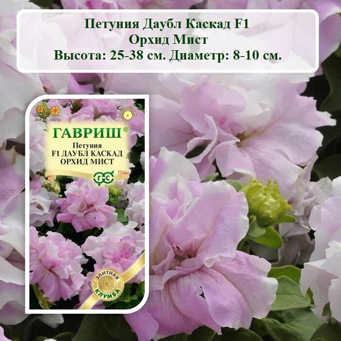 **Семена цветов Гавриш петуния Даубл Каскад Орхид Мист** — однолетнее растение. Оно вырастает до 38 см в высоту. Цветы махровые, окраска — нежно-розовая, от центра к волнистому краю расходятся темные прожилки. Может выращиваться в доме в балконном ящике, на клумбе в парке или на дачном участке. При составлении композиций следует размещать петунию на переднем плане, чтобы более высокие растения не загораживали ей свет.