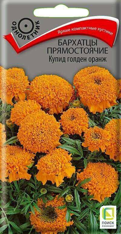 **Семена цветов Поиск бархатцы прямостоячие Купид голден** с очаровательными оранжевыми бутонами подходят для оформления клумб на дачном или приусадебном участке, в парке. Высаживаются в том числе с вазонах, контейнерах. Хорошо смотрятся в композициях с высокорослыми растениями. В высоту цветы достигают 20 см.