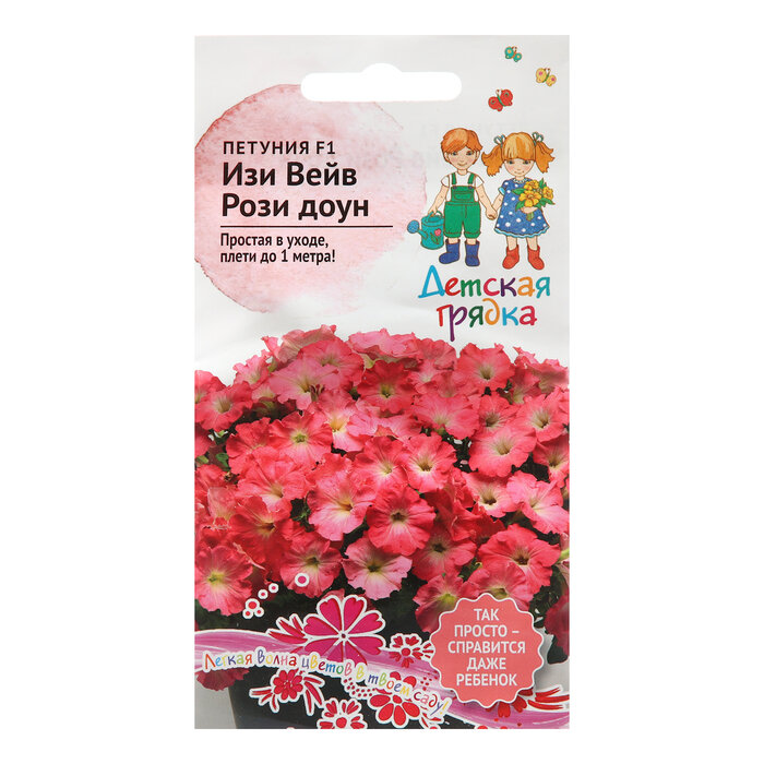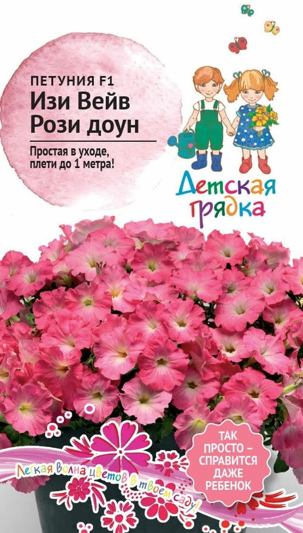 **Семена цветов Детская грядка петуния Изи Вейв Рози Доун F1** — однолетнее растение. Оно вырастает до 1 м в высоту. Цветы небольшие, окраска — розовая. Может выращиваться в доме в балконном ящике, на клумбе в парке или на дачном участке. При составлении композиций следует размещать петунию на переднем плане, чтобы более высокие растения не загораживали ей свет.