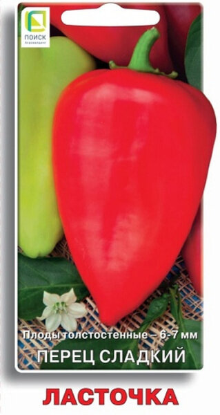 **Семена овощей Поиск перец сладкий Ласточка** — среднеспелый сорт. Высевается на рассаду в марте, в грунт пересаживается в мае. От первых всходов до начала сбора урожая проходит в среднем 105-165 суток. Отличается средним ростом — не превышает 0,6 м.