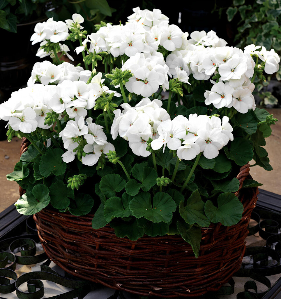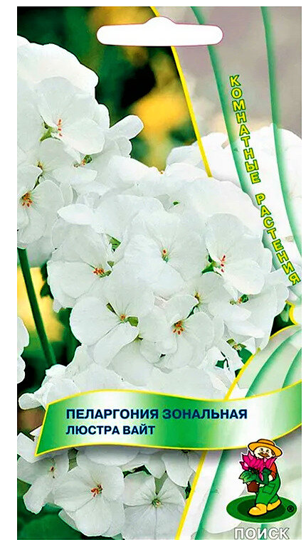 **Семена цветов Поиск пеларгония зональная Люстра вайт** — растение, которое высаживают в горшки или балконные ящики, а также в открытый грунт. Предпочитает солнечные площадки и рыхлый, плодородный грунт. В высоту достигает 35 см. Листочки обладают округлой формой и дополнены оригинальным рисунком в виде подковы. Цветы белого цвета, достигают 2,5 см в диаметре.