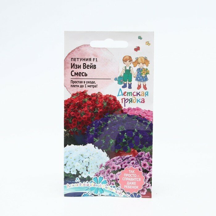 **Семена цветов Детская грядка петуния Изи Вейв F1** — однолетнее растение. Оно вырастает до 1 м в высоту. Цветы небольшие, окраска — разноцветная. Может выращиваться в доме в балконном ящике, на клумбе в парке или на дачном участке. При составлении композиций следует размещать петунию на переднем плане, чтобы более высокие растения не загораживали ей свет.
