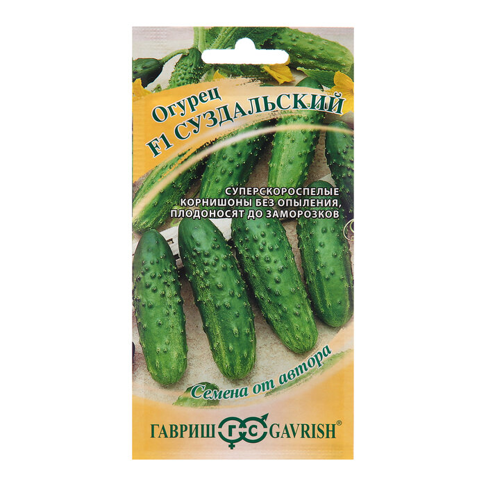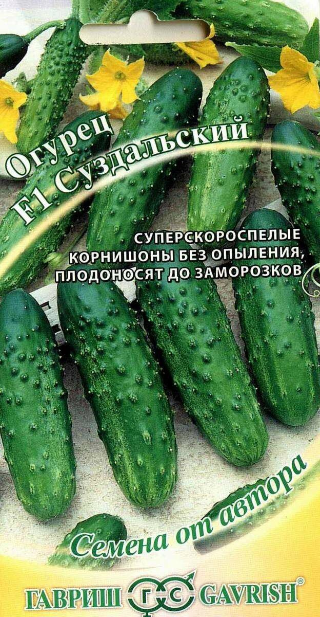 **Огурец Суздальский** — скороспелый гибрид, не нуждающийся в опылении, от всходов до урожая 45 дней. Выращивается в отрытом и защищенном грунте, под пленочными укрытиями. Плоды длиной до 12 см, массой до 100 г, с крупными бугорками, с тонкой кожицей и нежной негорчащей мякотью. Лежкие, хорошо транспортируются. Прекрасно подходят для свежих блюд, засолки и маринования. С одного растения собирают до 6.5 кг урожая.