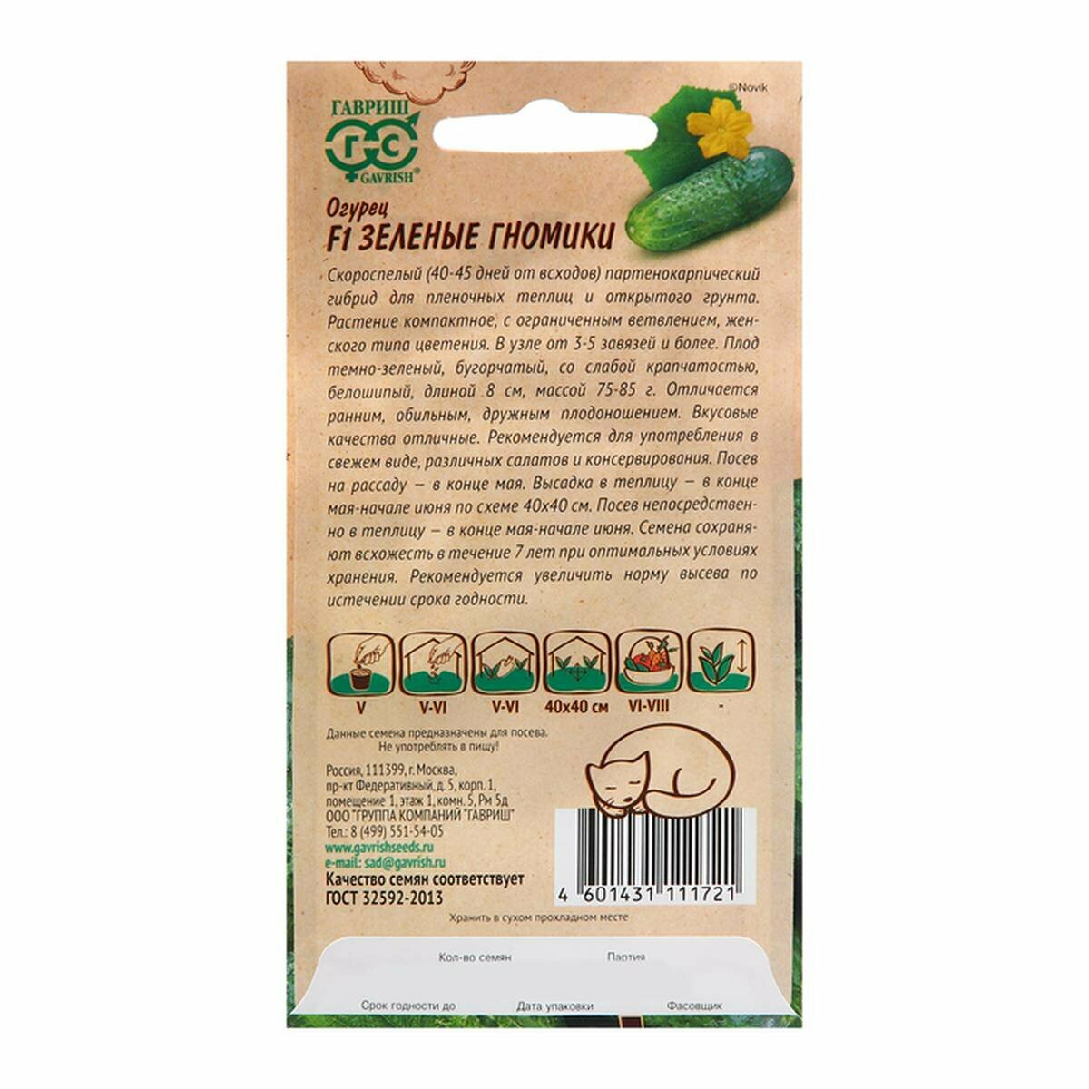 **Огурец Зеленые Гномики F1** — скороспелый гибрид, от всходов до сбора урожая 45 дней. Подходит для теплиц и открытого грунта, не нуждается в опылении. Дает большое количество плодов массой до 85 г с отличным вкусом без горечи, с выраженными бугорками. Употребляется свежим и консервированным. На рассаду сажается в конце мая, в теплицу — конце мая-начале июня.