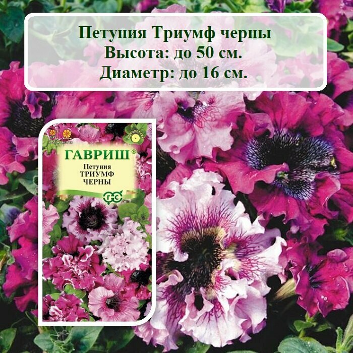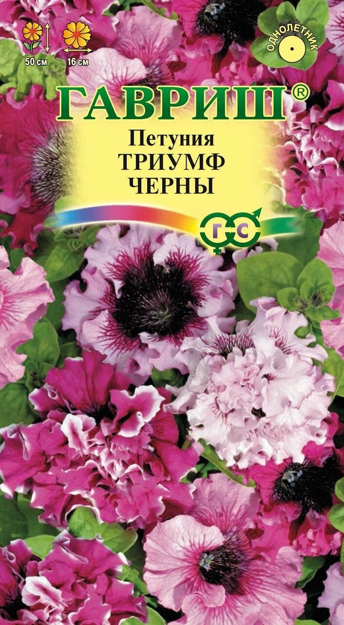**Петуния бахромчатая Триумф Черны** — сорт с огромными бахромчатыми цветами диаметром до 16 см, кусты мощные, но компактные, достигают 50 см в высоту. Подходит для широкого круга мест, от клумб и бордюров до вазонов и ящиков. Поверхностный посев проводят с февраля по март, на постоянное место пересаживают, когда кончаются заморозки. При зимнем засеве необходимо досвечивать. Любит солнечные места с плодородными дренированными почвами.