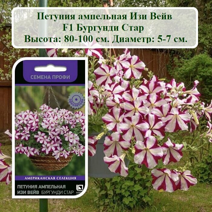 **Семена цветов Детская грядка петуния Изи Вейв Бургун Стар F1** — однолетнее растение. Оно вырастает до 1 м в высоту. Цветы небольшие, окраска — разноцветная, от центра к волнистому краю расходятся темные прожилки. Может выращиваться в доме в балконном ящике, на клумбе в парке или на дачном участке. При составлении композиций следует размещать петунию на переднем плане, чтобы более высокие растения не загораживали ей свет.