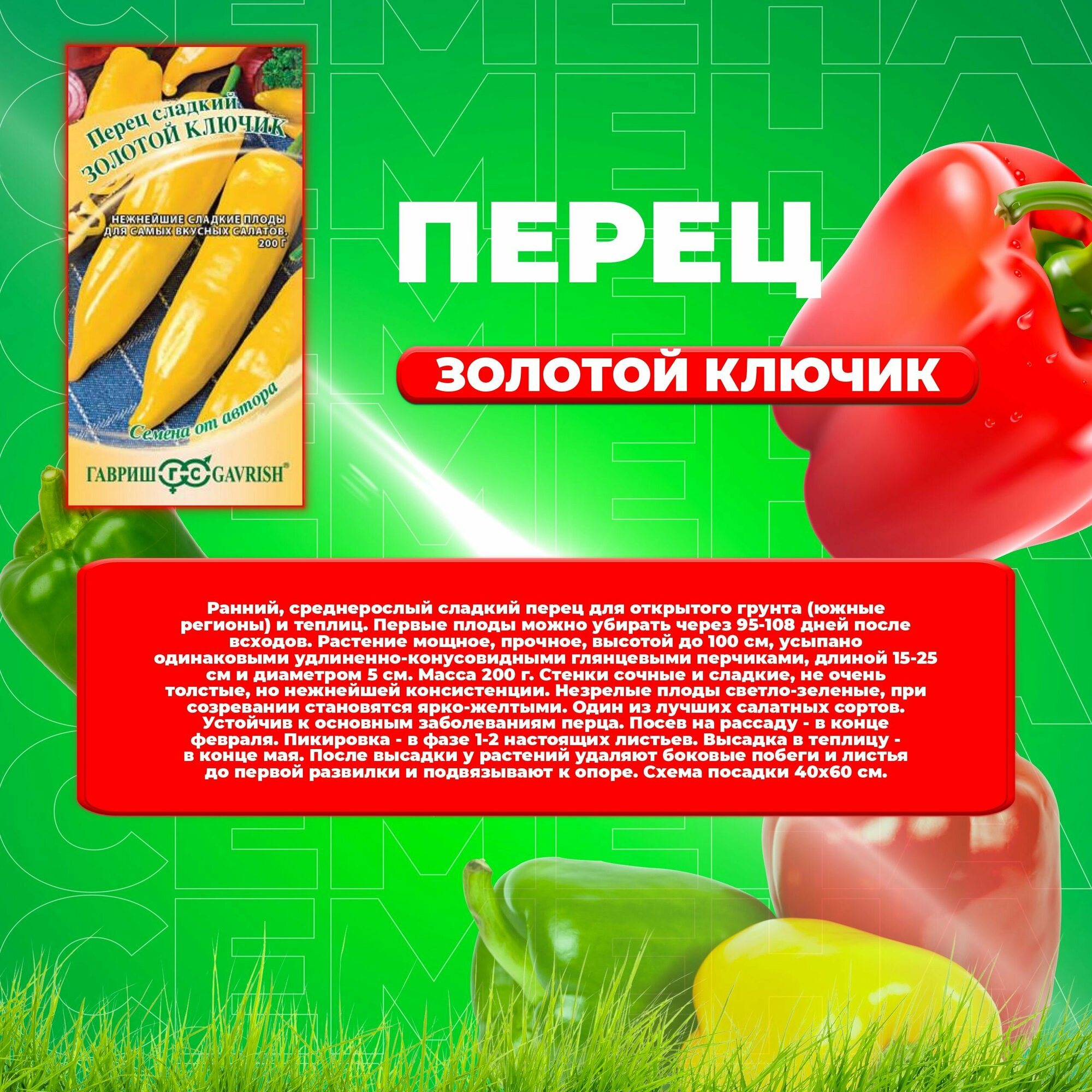 **Перец Золотой Ключик** — нежнейший сладкий перец для самых вкусных салатов. Подходит для выращивания в теплицах, в южных регионах допустимо сажать в открытый грунт. Через 95-108 дней после всходов можно собирать плоды массой до 200 г. Устойчив к основным заболеваниям культуры. На рассаду высаживается в конце февраля, в теплицу — в конце мая. Не сажайте рядом с острым перцем во избежание переопыления.
