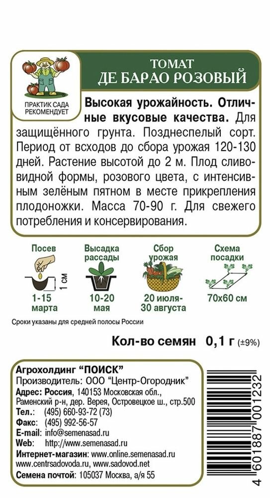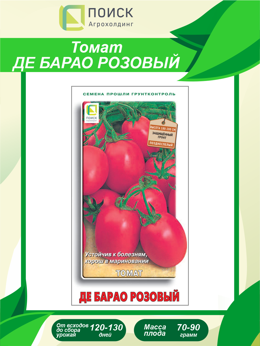 **Семена овощей Поиск томат Де Барао розовый** подходят для выращивания рассадным способом в теплице. Сорт позднеспелый — от всходов до сбора урожая проходит 120-130 суток. Растение высокое, достигает 2 м. Требует подвязки к опоре.