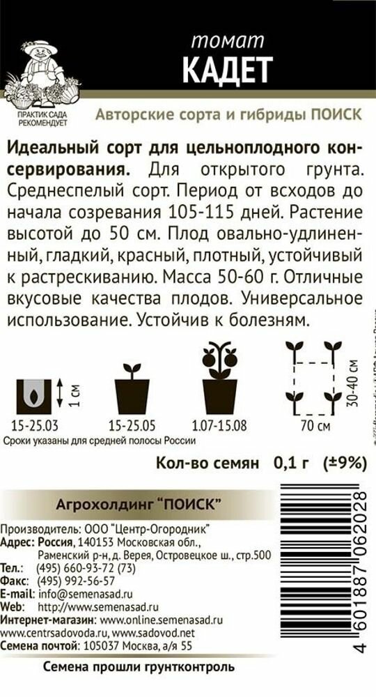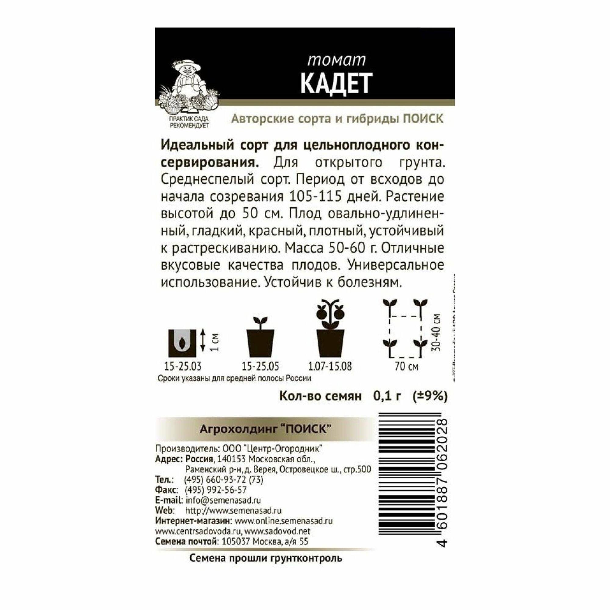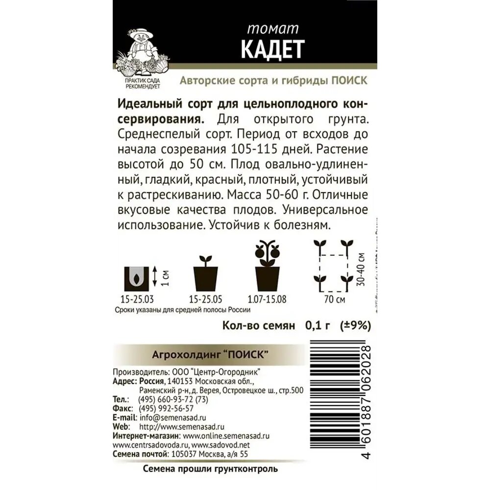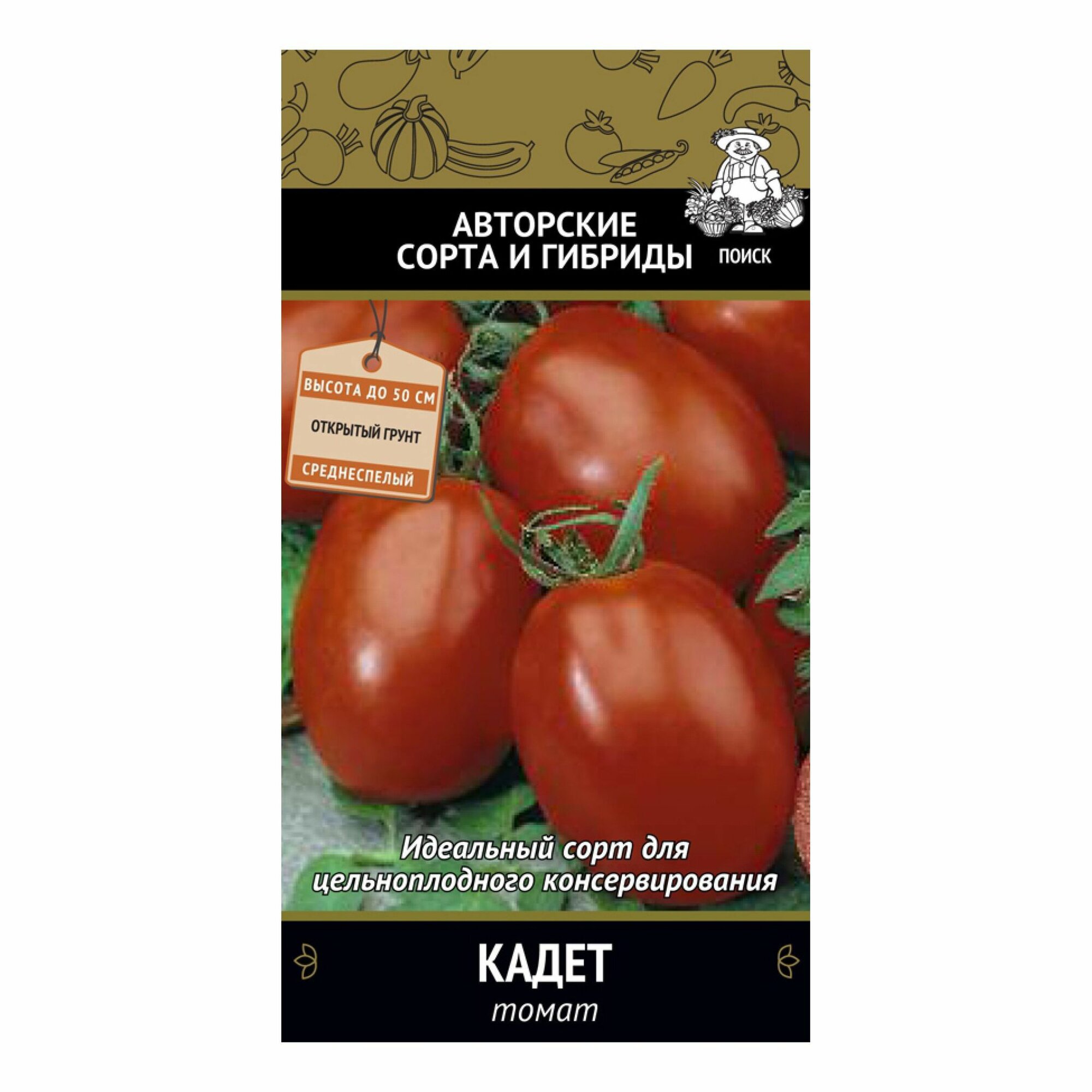 **Семена овощей Поиск томат Кадет** подходят для выращивания рассадным способом в открытом грунте. Сорт среднеспелый — от всходов до сбора урожая проходит 105-115 суток. Растение достигает 0,5 м.