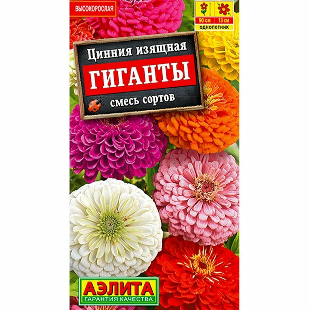 **Цинния Гиганты** — один из наиболее мощных сортов, высокий (до 90 см) и с крупными цветами, достигающими 13 см. Соцветия плотные, махровые, стебли мощные, подходит для украшения цветника и срезки. Это сорт довольно неприхотлив, его легко вырастить садоводу-новичку. Цинния предпочитает хорошо освещенные участки с дренированной почвой нейтральной кислотности, устойчива к засухе. На рассаду ее сажают в начале-середине апреля, пересаживают в грунт в конце мая, для южных регионов допустимо выращивание без рассады. Цветет с июля до осени.