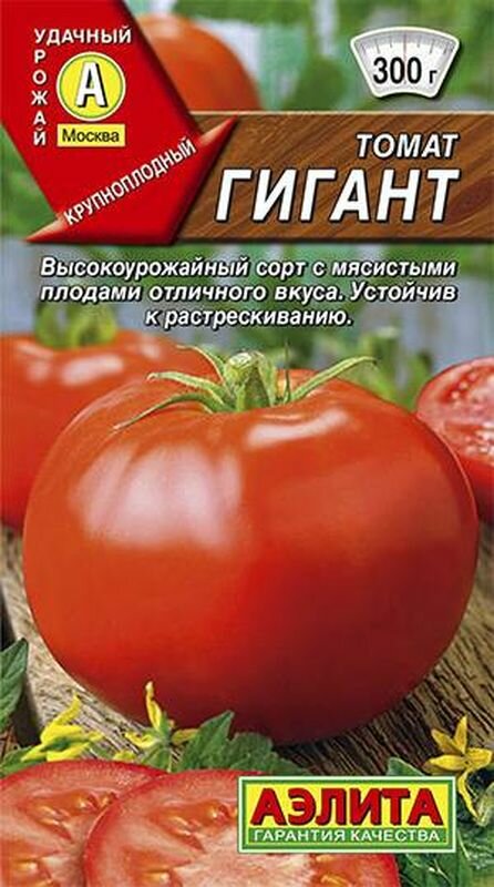 **Томат Гигант** — крупноплодный среднеспелый сорт, от всходов до сбора 110-115 дней. Подходит для выращивания в открытом грунте и пленочных теплицах, урожайность с одного квадратного метра теплицы не менее 10 кг. Помидоры мясистые и сочные, масса 150-200 г, возможны экземпляры до 300 г, обладают насыщенным вкусом сладковатым с легкой кислинкой. Сорт неприхотливый, не боится похолодания и жары. Семена сажают на рассаду в конце марта-начале апреля. С середины мая высаживают в грунт, подвязывают к кольям. На открытом грунте прищипывают точку роста и удаляют кисти без завязей.