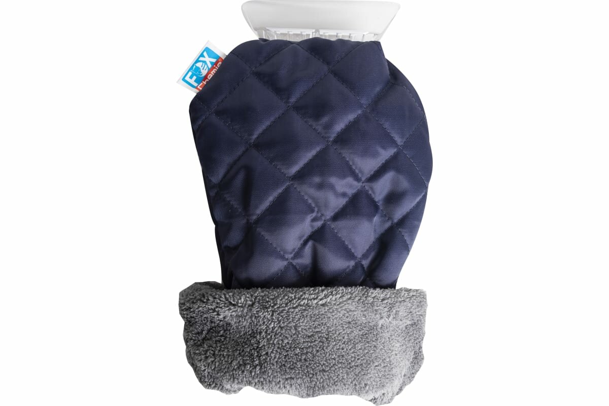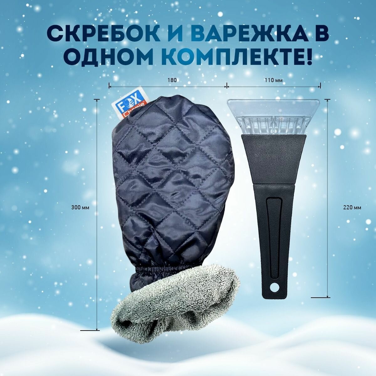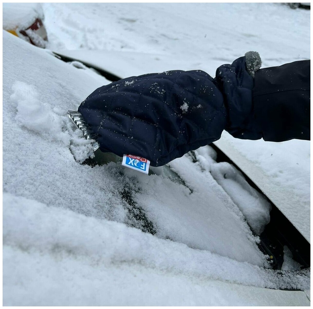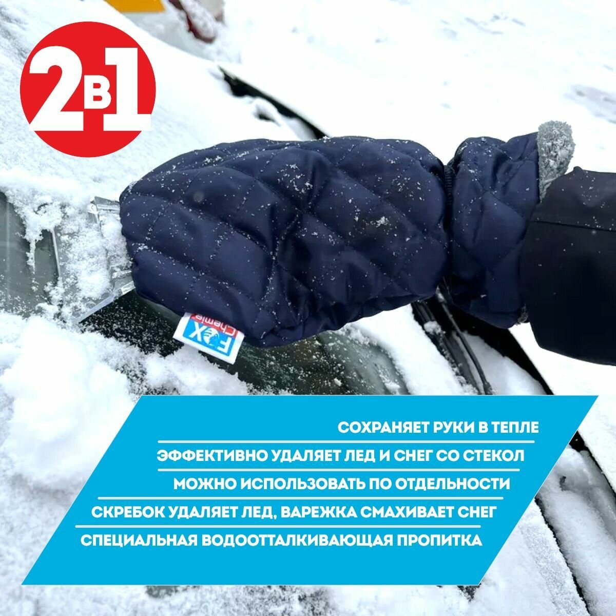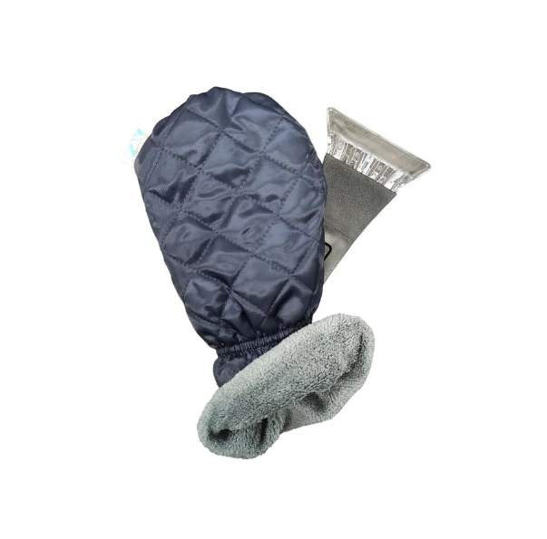 **Универсальная Варежка-скребок 2 в 1 для ухода за автомобилем в зимний период** Преимущество варежки в ее бережном очищении кузова. В случае отсутствия ледяной корки варежка может использоваться без скребка. Если на стеклах автомобиля имеется ледяная корка, которую надо снять, то в варежку вставляется скребок, ручка скребка находится внутри варежки, что сохраняет руки от мороза, сам скребок выступает из варежки, и быстро удаляет ледяную корку, благодаря своей форме. Универсальный размер варежки подойдет как для мужской, так и для женской руки. Автомобильная варежка-скребок – полезный инструмент для водителя, необходимый каждому автовладельцу в холодное время года.