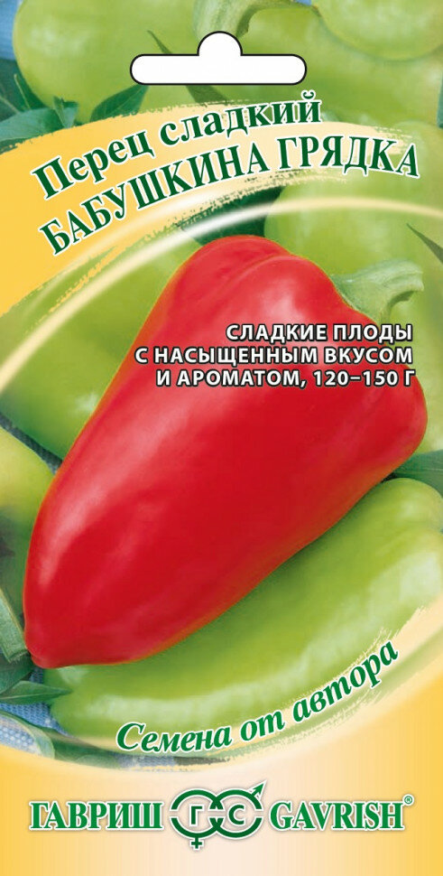 **Перец Гавриш Бабушкина грядка** – это семена среднераннего сорта, который подходит для открытого грунта, теплиц и временных пленочных укрытий. От появления всходов до первых спелых плодов проходит 115-123 дня. Среднерослая среднеоблиственная культура достигает высоты в 1-1,3 м. Толстостенные, блестящие, конусовидные, поникшие плоды имеют сладковатую мясистую мякоть. Цвет плодов в биологической спелости красный, а в технической – зелено-беловатый. Семена овощей сеют в конце февраля, заделывая их до 1 см. Высадку в теплицу делают в конце мая. Пикировку выполняют при появлении 1-2 листиков. С 1 м2 можно получить до 6 кг. Плоды рекомендуются для приготовления разных блюд и консервации.