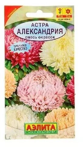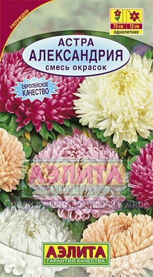 **Астра Александрия** — смесь окрасок универсальных астр. Соцветия густомахровые, размером 10-13 см, на мощных стеблях длиной до 70 см, идеальны для срезки, она стимулирует появление новых бутонов. Хорошо выглядят в сборных цветниках рядом с однолетниками, цветущими поздним летом и осенью.