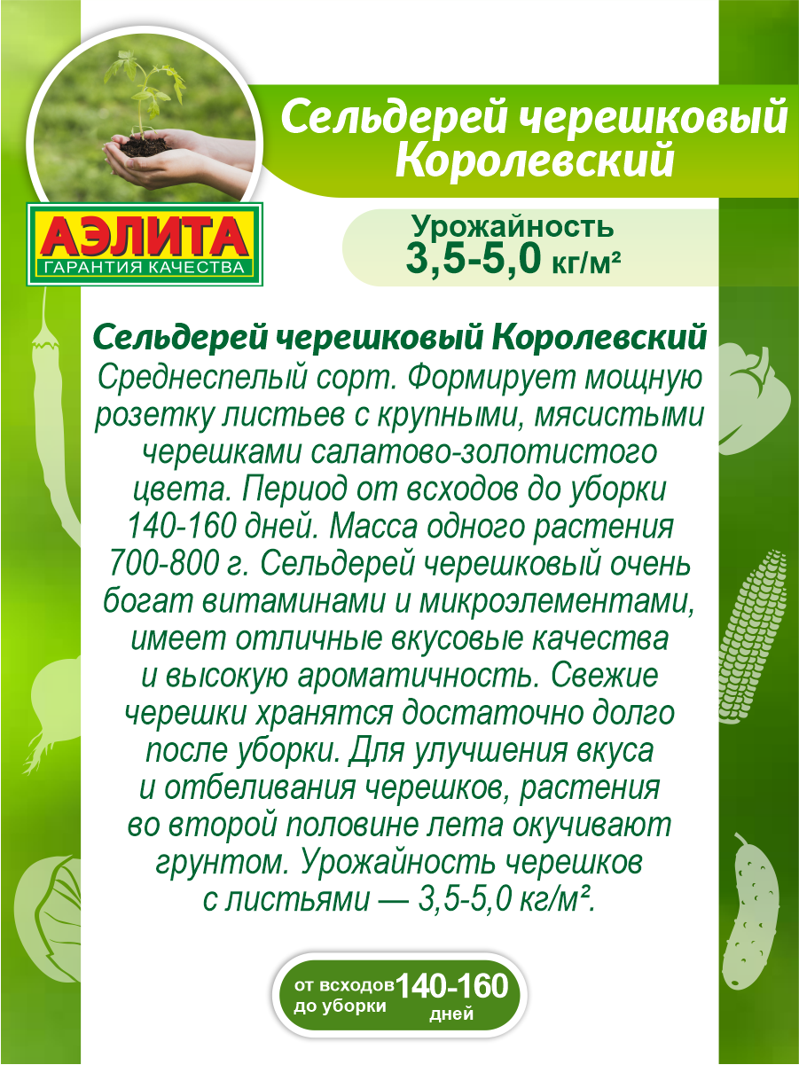 **Сельдерей Черешковый Королевский** отличается высокой урожайностью (3.5-5 кг с квадратного метра), привлекательным товарным видом и выраженным ароматом. Сорт среднеспелый, от всходов до сбора 140-160 дней. Каждое растение весом до 800 г, несет мощную розетку листьев с мясистыми черешками. Чрезвычайно богат полезными веществами, приятен на вкус, используется в свежем и размороженном виде для салатов, супов, приправ. Семена сажают на рассаду в начале-конце марта под стекло или пленку, важно обеспечить доступ к свету. Пересаживают в грунт в середине-конце мая.