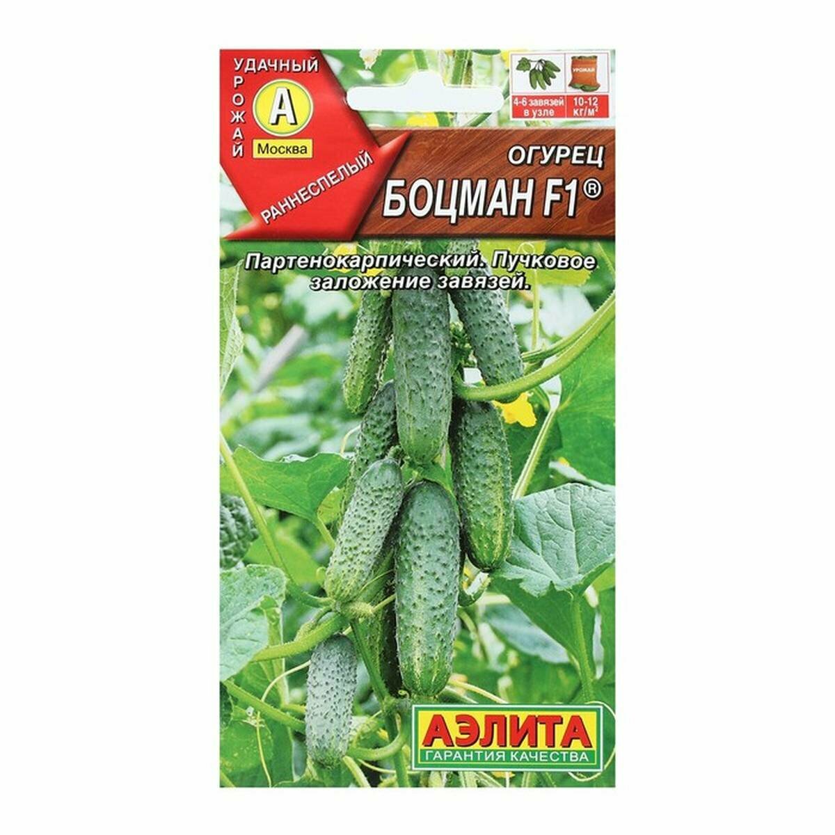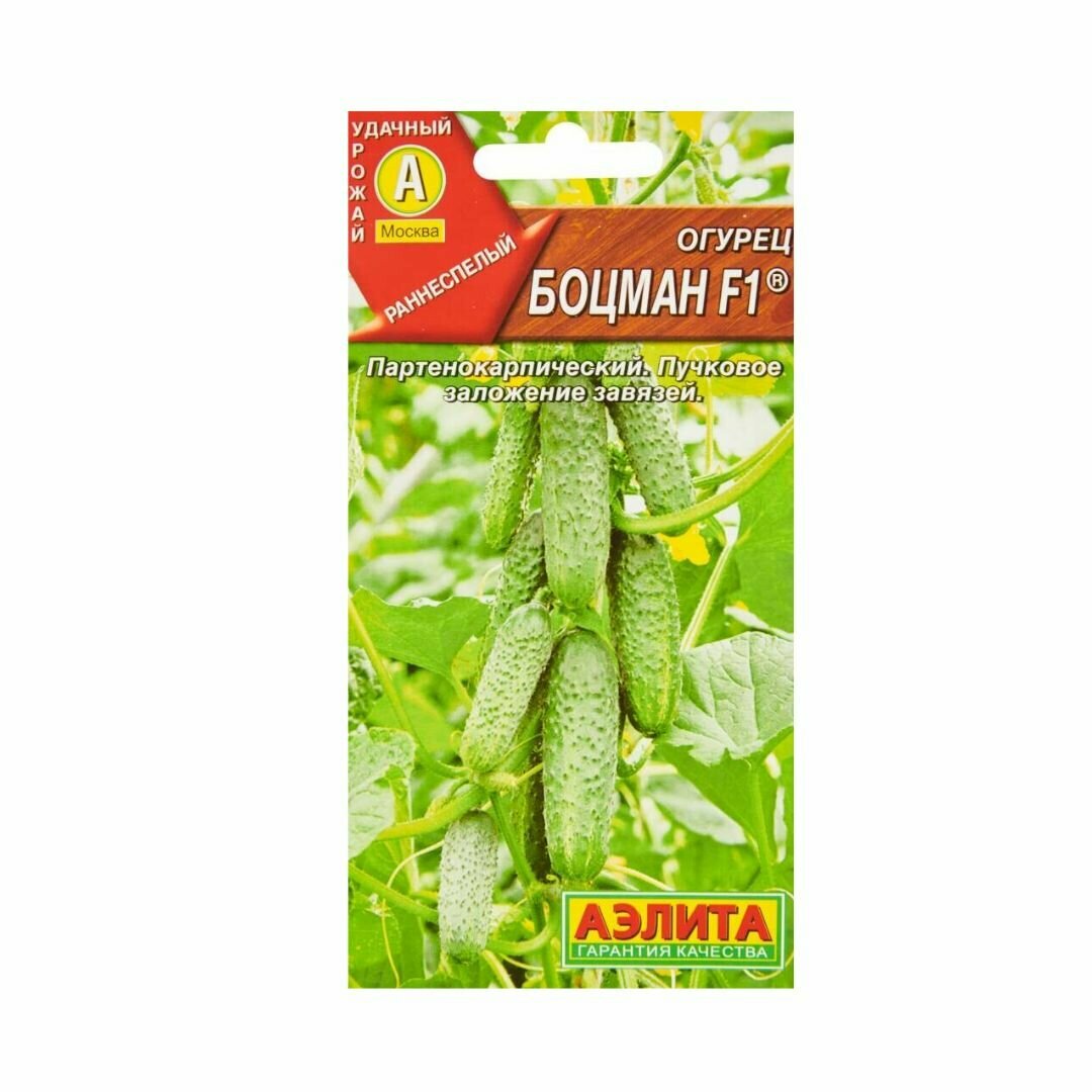 **Семена Аэлита огурец Боцман F1** — раннеспелый гибрид, от первых всходов до начала съема овощей проходит 46-50 дней. Рекомендован для защищенного грунта. Растения женского типа цветения, плетистые. Зеленцы цилиндрические, вес — до 90 г. Поверхность бугристая, мякоть хрустящая, сочная, без горечи. Подходят для употребления в пищу в свежем виде и в консервацию. Урожайность составляет до 12 кг на квадратный метр посевов.
