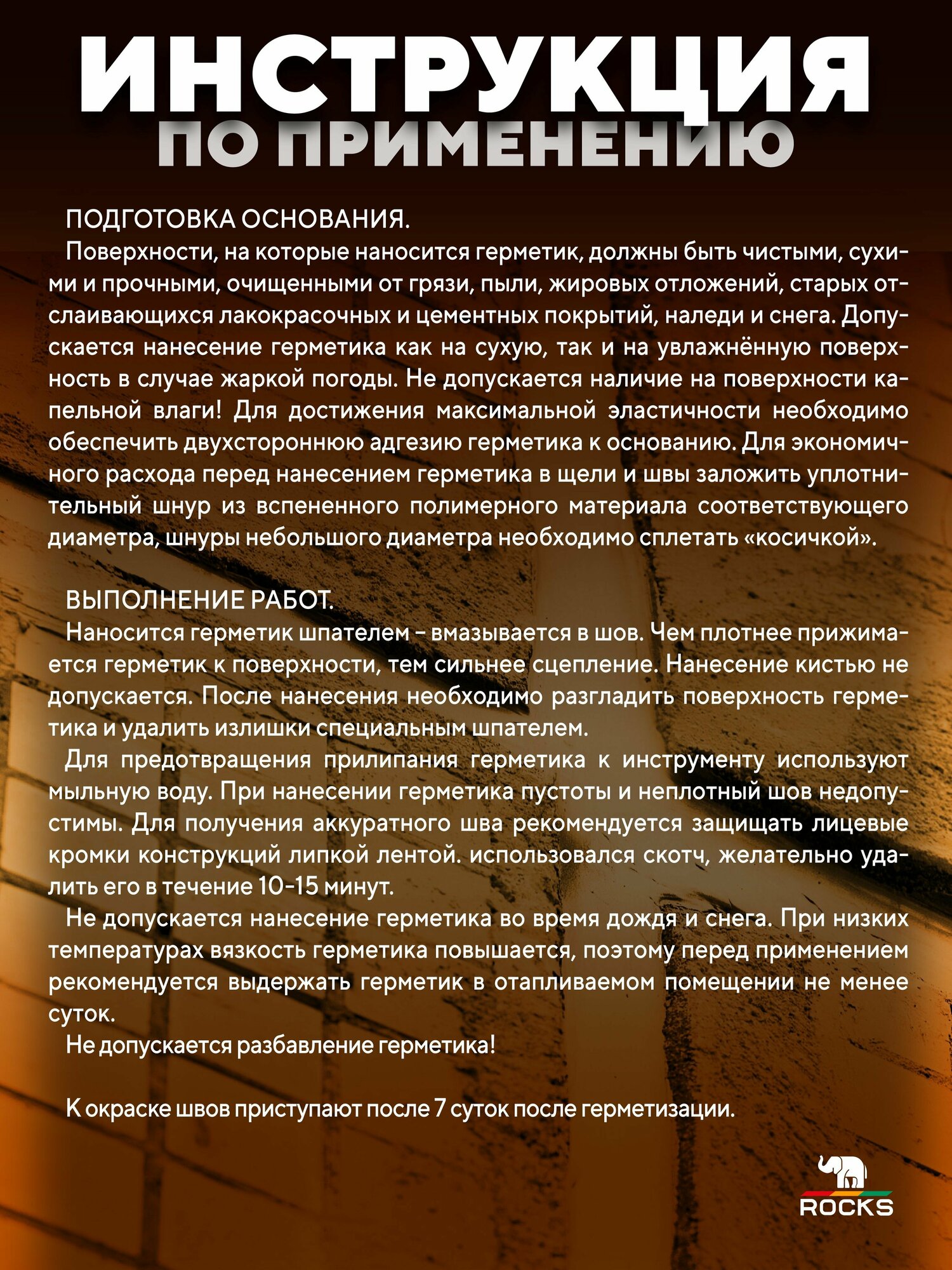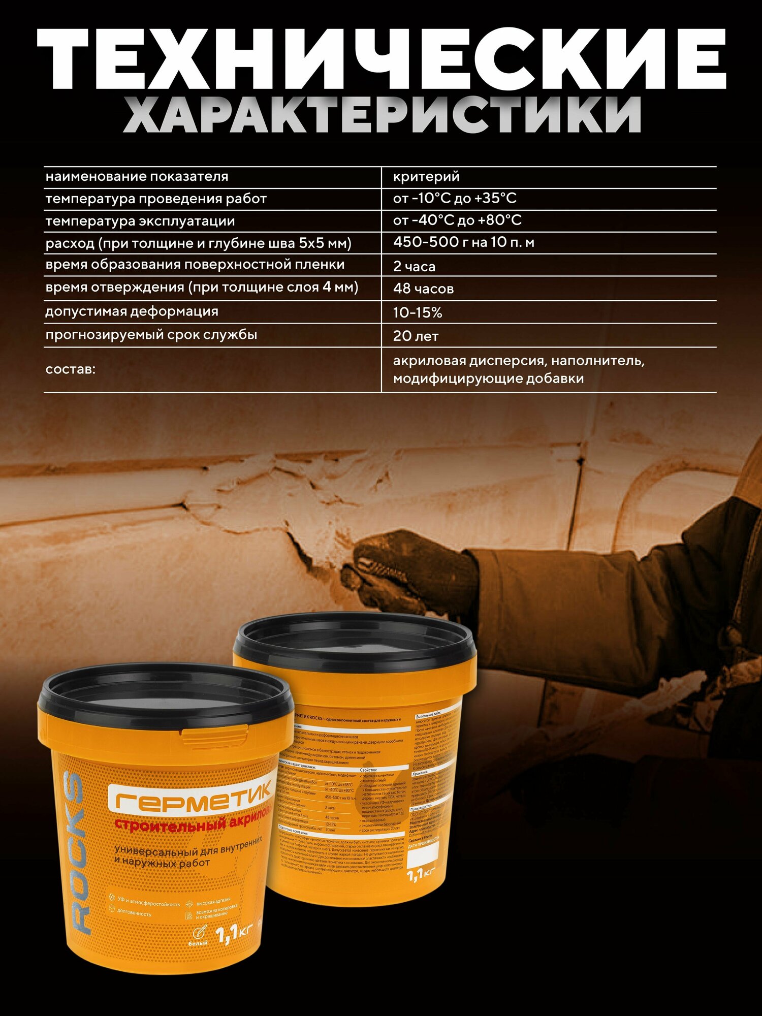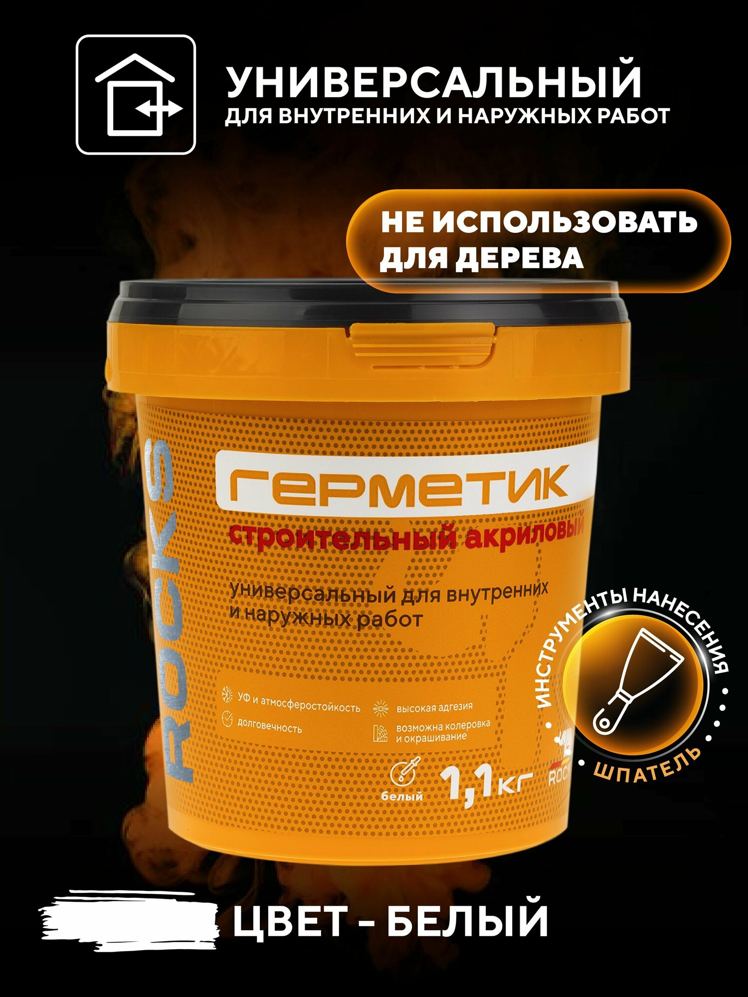 **Герметик строительный акриловый Rocks** применяется для герметизации стыков деревянных, металлических и пластиковых поверхностей. Служит уплотнителем для оконных и дверных блоков, кровельных соединений, вводов и выводов коммуникаций. Может накладываться поверх монтажной пены для защиты ее от негативного воздействия солнечных лучей и влаги.