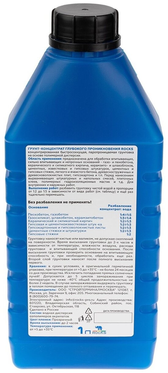 **Грунт-концентрат глубокого проникновения Rocks** используется для обработки впитывающих поверхностей, непрочных оснований из газо- и пенобетона, силикатного кирпича, керамзита, шлакобетона, гипса и гипсокартона, древесностружечных плит. Предназначен для использования в качестве выравнивания основания перед нанесением штукатурных смесей, гидроизоляции, плиточных клеев.