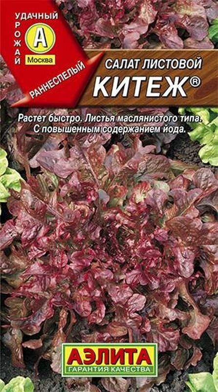 **Салат Китеж** — ранний сорт, чья розетка достигает полного развития через 40 дней от всходов. Обильно растет при любой продолжительности светового дня. В открытом грунте выращивается с ранней весны до поздней осени, в закрытом круглогодично. Дает до 2.5 кг урожая с квадратного метра. Отличается нежным и насыщенным вкусом, листья маслянистые, темно-рубиновые, с повышенным содержанием йода.