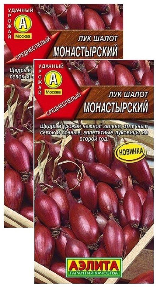 **Лук шалот Монастырский** — обеспечивает щедрый урожай нежной зелени, отличный севок в первый год и аппетитные крупные луковицы во второй. Отличается великолепным сочным вкусом и большим количеством витаминов. Более пикантный, чем репчатый, мякоть ароматная, розоватая, сочная. От всходов до сбора урожая 65-80 дней. Собирают с 1,8 до 3 кг на квадратный метр.