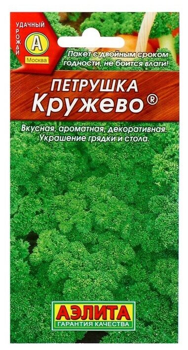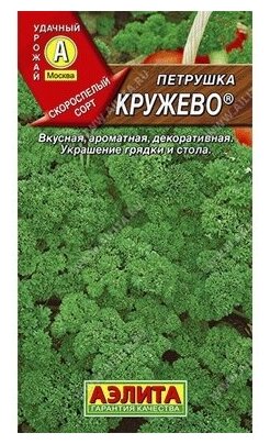 **Петрушка Кружево** — кудрявый скороспелый сорт, готов к срезке через 60 дней после всхода, быстро отрастает после срезки. Листья ароматные, с одного квадратного метра можно собрать более 4 кг. Семена высаживаются в предварительно сделанные бороздки в конце апреля-начале мая, возможен зимний подсев в конце октября-начале ноября.