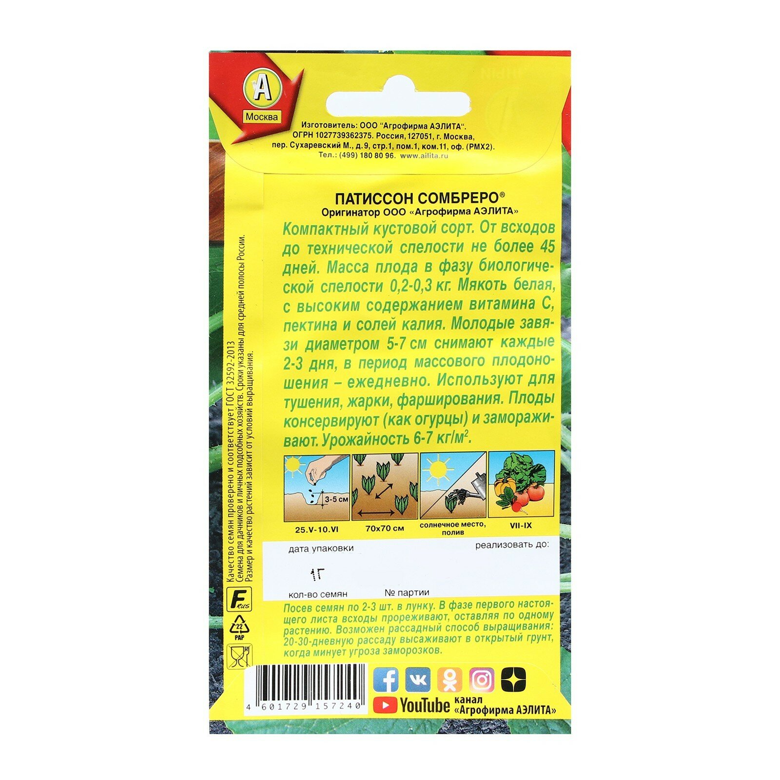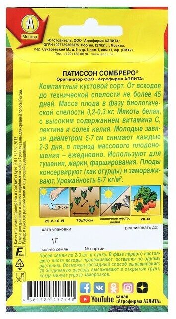 Семена овощей Аэлита патиссон Сомбреро