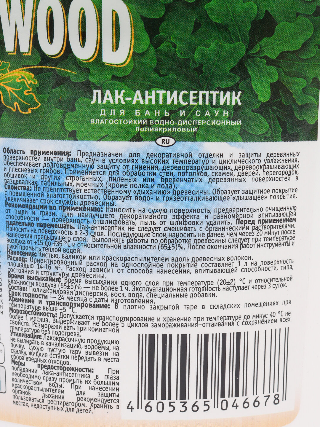 **Лак-антисептик водно-дисперсионный Profiwood** образует бесцветное полуглянцевое покрытие. Увеличивает срок службы древесины и защищает ее от плесени, грибка и воздействия насекомых. Характеризуется устойчивостью к высоким температурам. Используется для обработки стен, потолков, перегородок, обшивки и других деревянных поверхностей: строганых, пиленых или бревенчатых. Продукт произведен из воды, полиакриловой дисперсии, этиленгликоля и функциональных добавок. Наносить следует на сухую и чистую поверхность. Чтобы добиться наилучшего декоративного эффекта, поверхность рекомендуется отшлифовать. Наносить в 2-3 слоя. Выполнять работы при температуре от +15°C до +35°C.