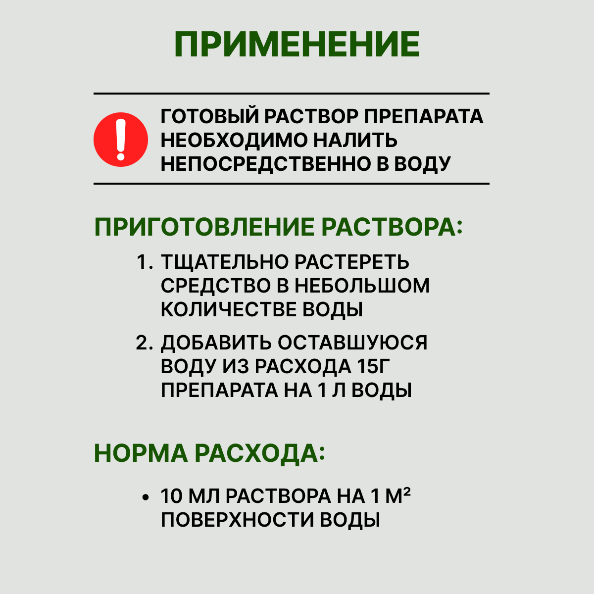 | Расход (г / м² , мл/ м²) | 15г на литр/ обработка 5мл на 1 м кв. |