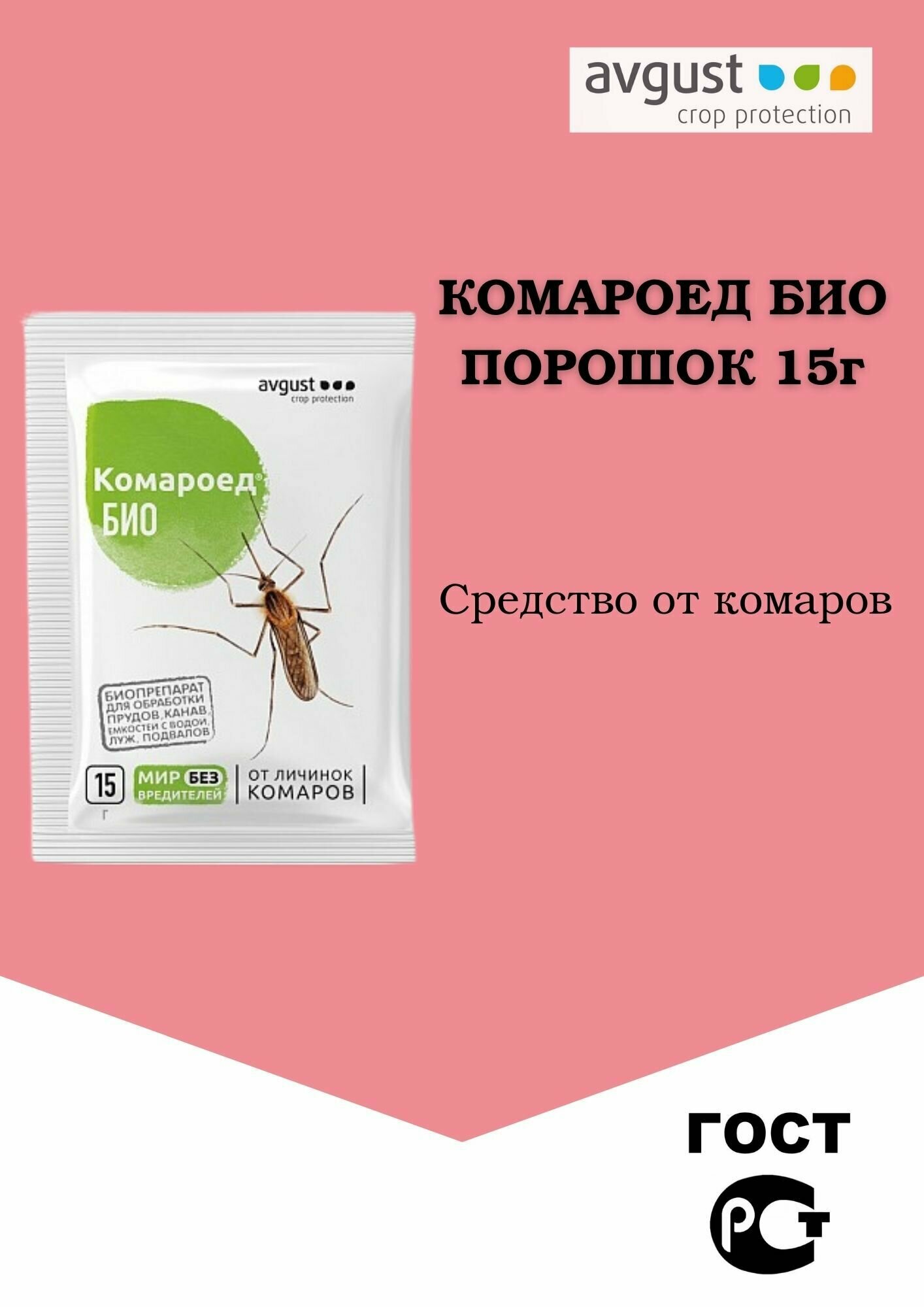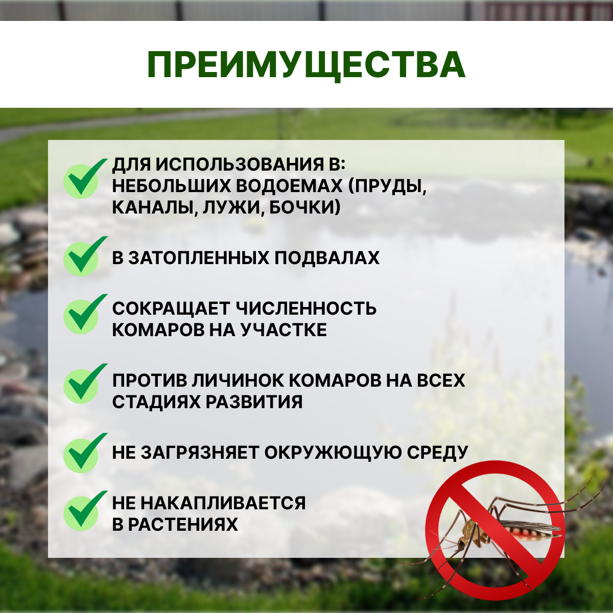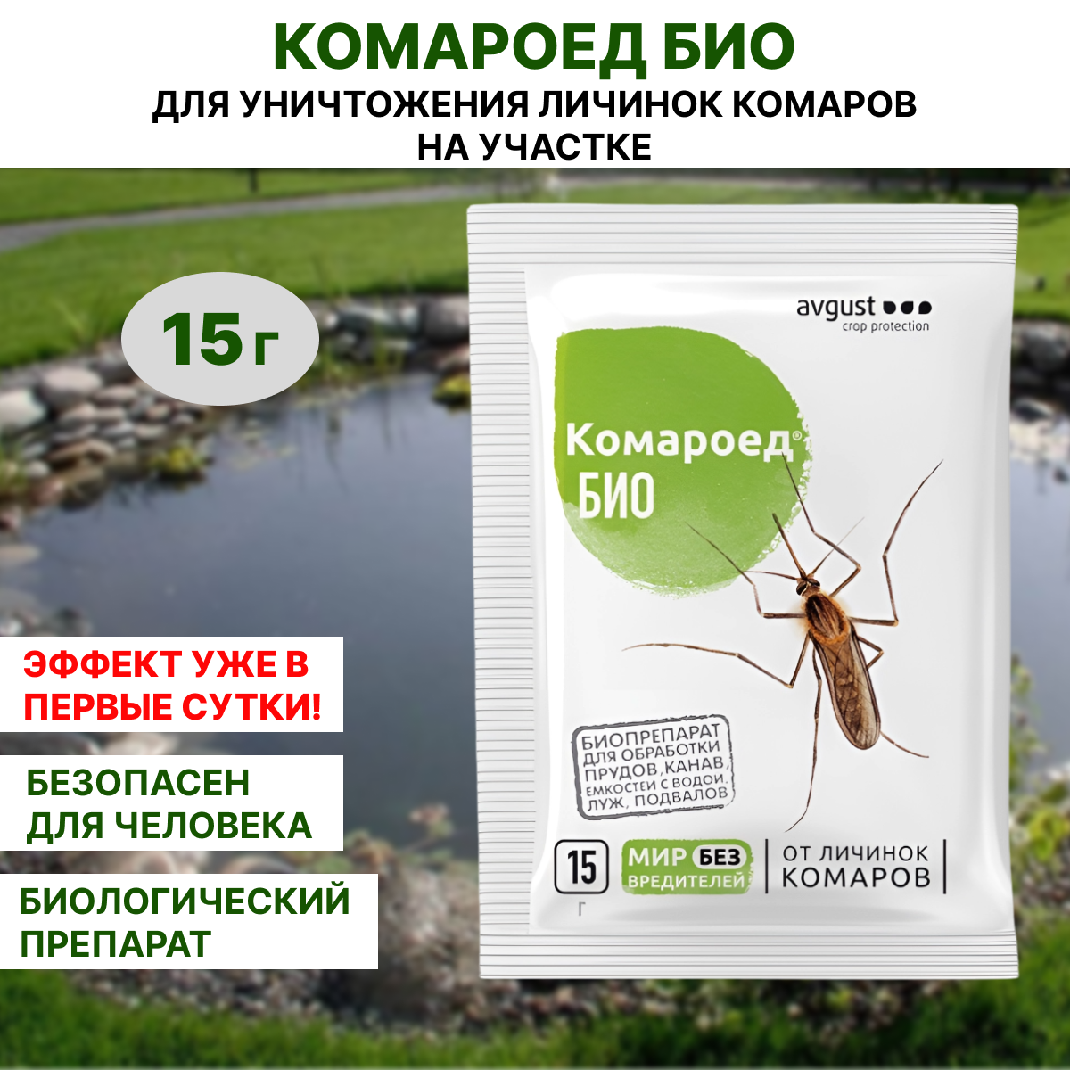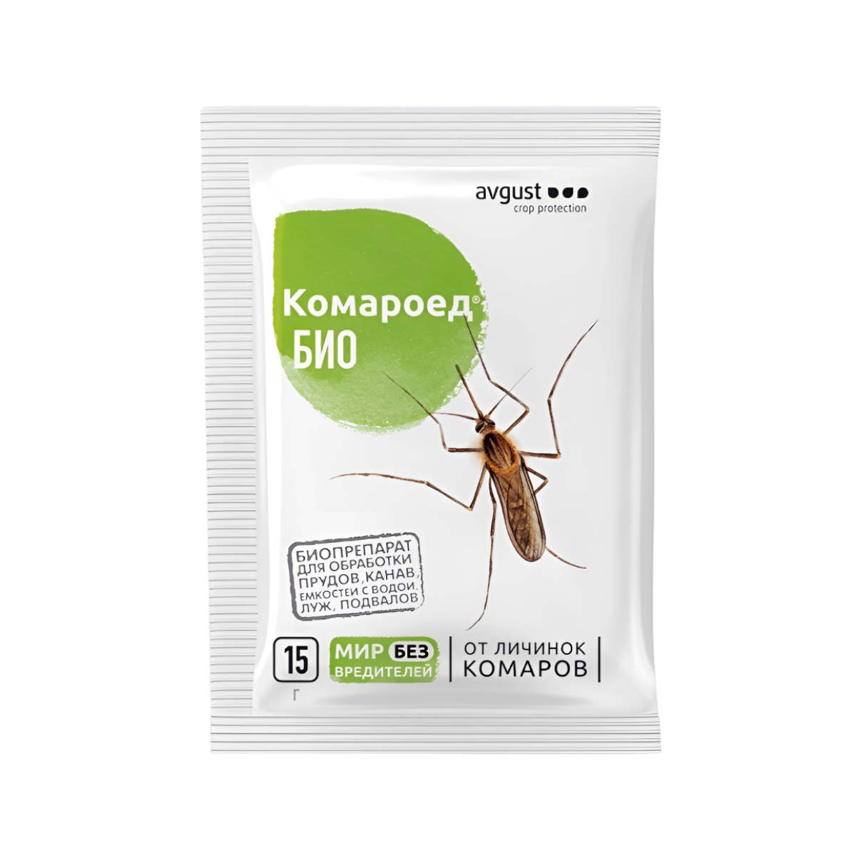 | Назначение (животные, насекомые-вредители, болезни и др.) | Безопасный препарат от личинок комаров на участке. Применяется путем обрабтки мест выплода: прудов, канав, бочек, затопленных подвалов и др. |