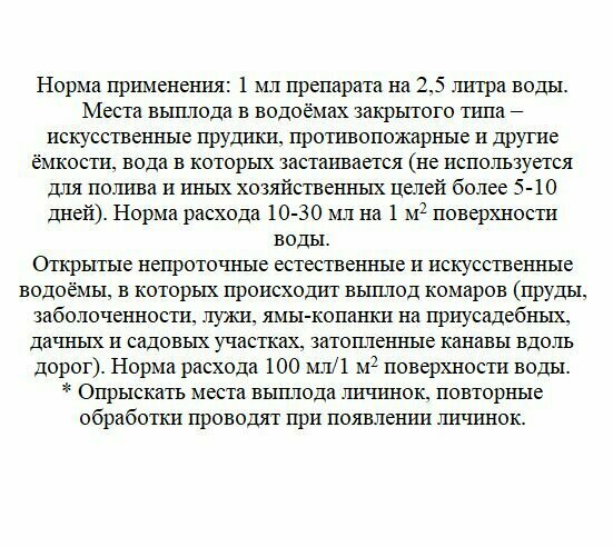 | Применение продукта | Обработку проводят в период массового появления личинок кровососущих видов комаров первого-третьего возрастов. Обработке подлежат небольшие водоемы (пруды, канавы, копанки, непересыхающие лужи, бочки и другие ёмкости с водой) в которых могут развиваться комары, а также затопленные подвалы. Рабочие жидкости готовят непосредственно перед применением. Средство тщательно растирают в небольшом количестве воды до получения однородной пастообразной массы, затем разбавляют водой при непрерывном помешивании из расчета 15 г на 1 л воды. Рабочая концентрация 1,5% Расход рабочей жидкости: При обработке поверхности водоёмов – 10 мл/1м кв. При обработке затопленных подвалов – 5 мл/1м кв. |