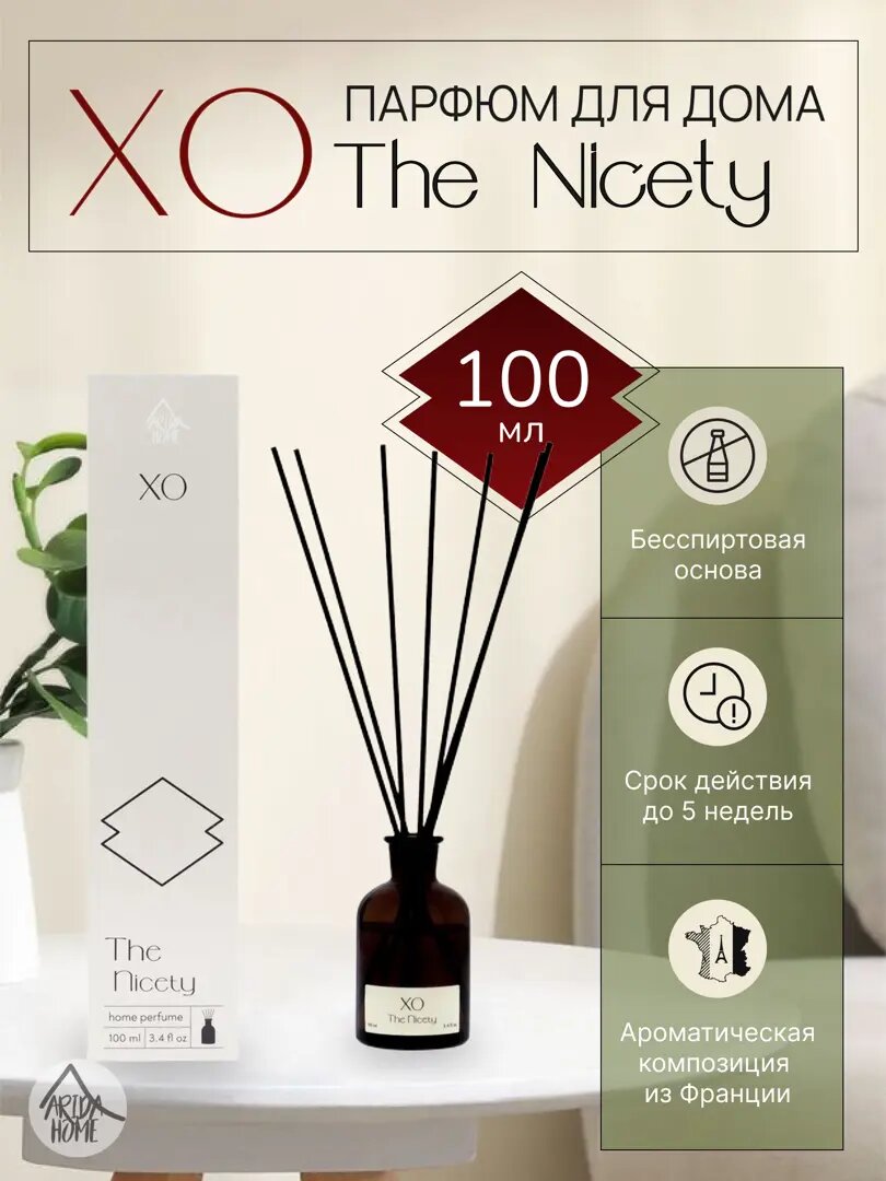 **Ароматический диффузор Arida Home ХО The Nicety** является универсальным средством, с помощью которого можно наполнить дом или офис легким, приятным запахом. Имеет бесспиртовую основу. Срок действия достигает 5 недель. Насыщенность аромата можно регулировать при помощи количества применяемых палочек. Последние обладают пористой структурой, за счет чего запах из емкости постепенно поднимается вверх и начинает активно распространяться. В результате формируется ненавязчивый фоновый аромат для комфортного отдыха и работы.