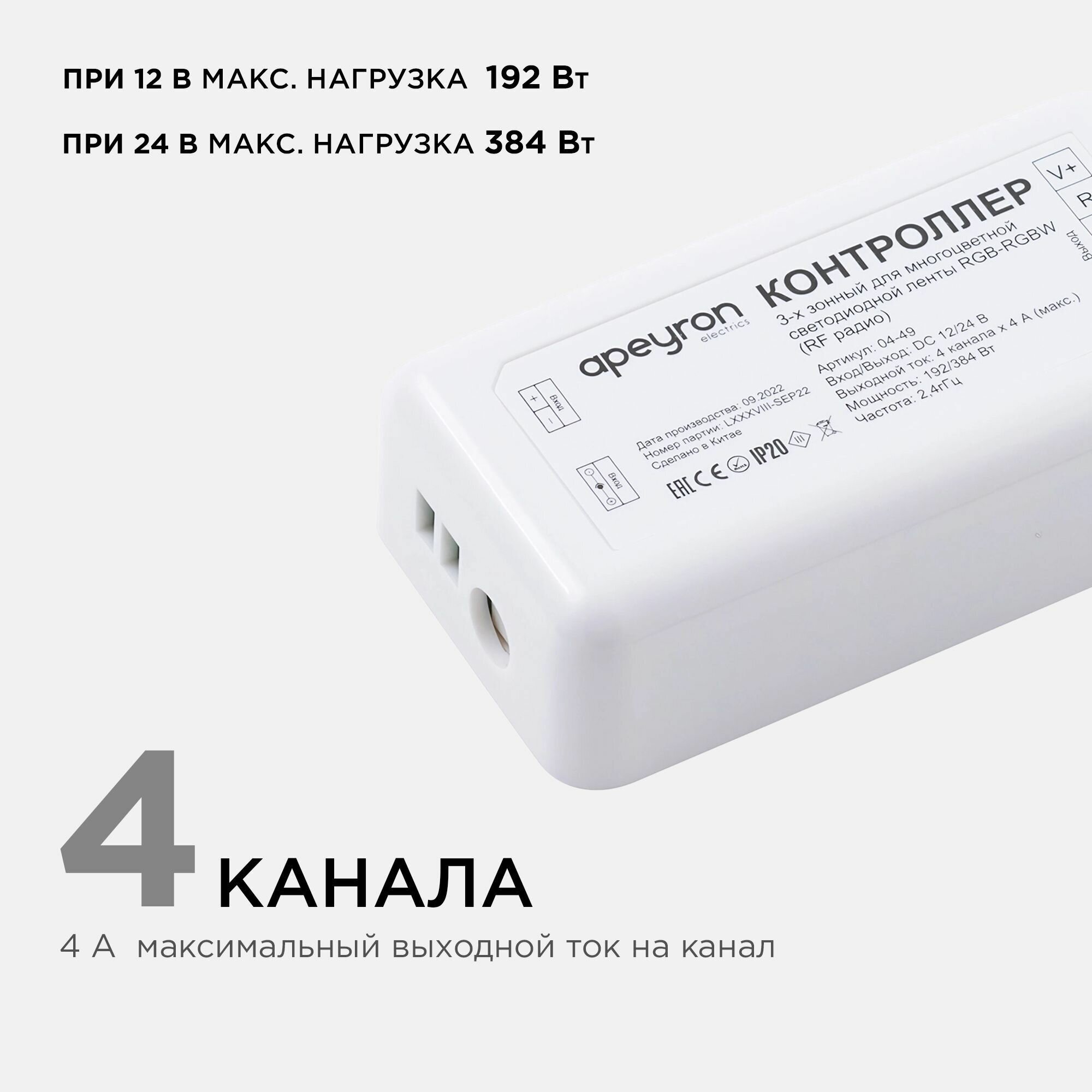 Трехзонный контроллер RGB-RGBW 04-49 предназначен для управления многоцветной светодиодной лентой RGB и RGBW. К 1 пульту управления можно подключить до 3-х контроллеров и управлять ими по отдельности, создавая нескольких зон освещения с уникальной световой и цветовой сценой для каждого помещения. С помощью контроллера можно регулировать цветовые оттенки, включать или выключать светодиодную ленту, выбирать различные динамические режимы свечения светодиодной ленты, регулировать яркость, а также подобрать комфортную скорость смены цветов в динамических режимах. Одно из преимуществ данного изделия заключается в возможности работать как от напряжения 12 В, так и 24 В, а значит его можно использовать со светодиодными лентами с соответствующим напряжением. Важно отметить, что в зависимости от того с каким напряжением предстоит работать устройству, будет отличаться и максимальная мощность нагрузки, которую можно подключить к нему. Так, при напряжении 12 В максимальная нагрузка будет равна 192 Вт, а при напряжении 24 В уже 384 Вт. Это значит, что к данному изделию вы можете подключить в два раза больше светодиодной ленты 24 В. Контроллер не укомплектован дистанционным сенсорным радиопультом управления (приобретайте арт. 04-48). Накладной корпус контроллера, выполненный из пластика, имеет компактный размер 85х45х23 мм, благодаря чему изделие можно разместить в узкой нише. Степень защиты от пыли и влаги соответствует стандарту IP20, что подразумевает установку устройства в сухом, проветриваемом помещении.Преимущества:- Управление многоцветной лентой RGB и RGBW;- Управление светодиодной лентой 12 В и 24 В;- Создание до 3-х зон освещения с уникальным световым и цветовым сценарием;- Удобное подключение ленты и блоков питания с помощью клеммных колодок;- Передача сигнала по радиоканалу.