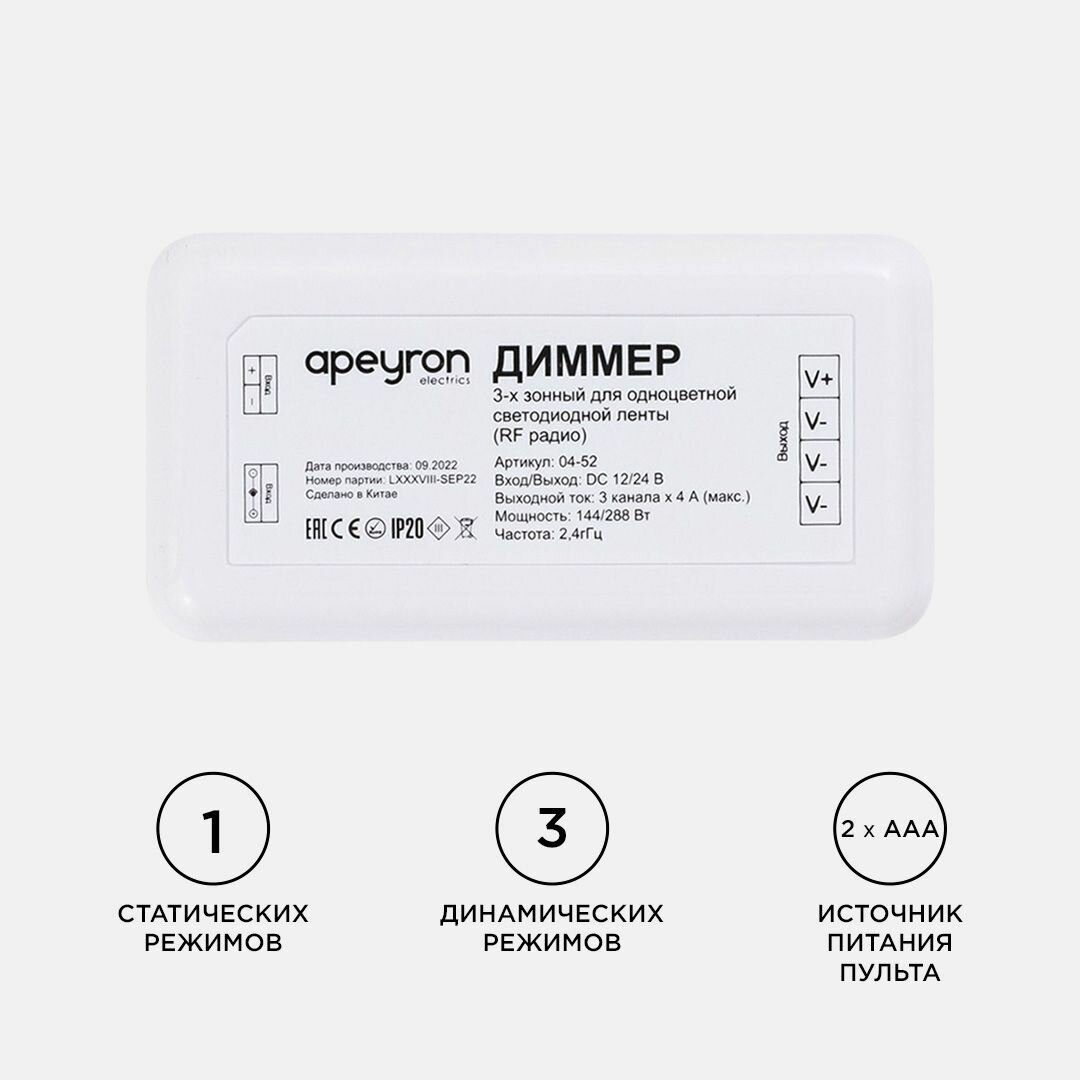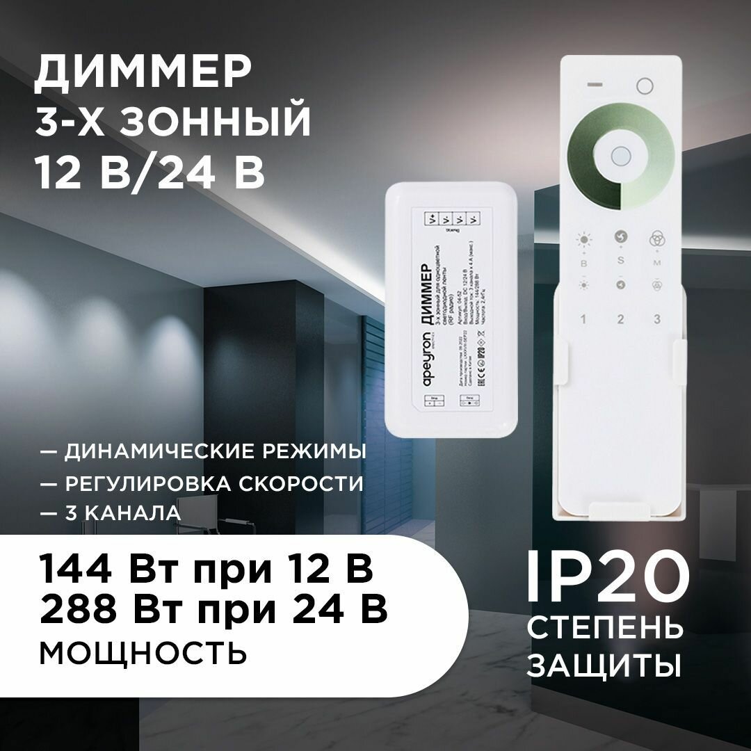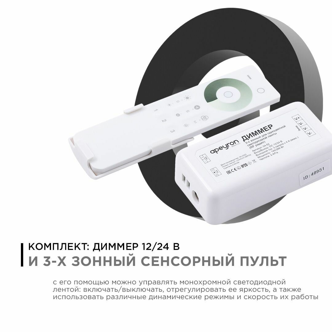 Диммер Apeyron для соединения светодиодной одноцветной ленты 12/24 В 144/288 Вт с пультом