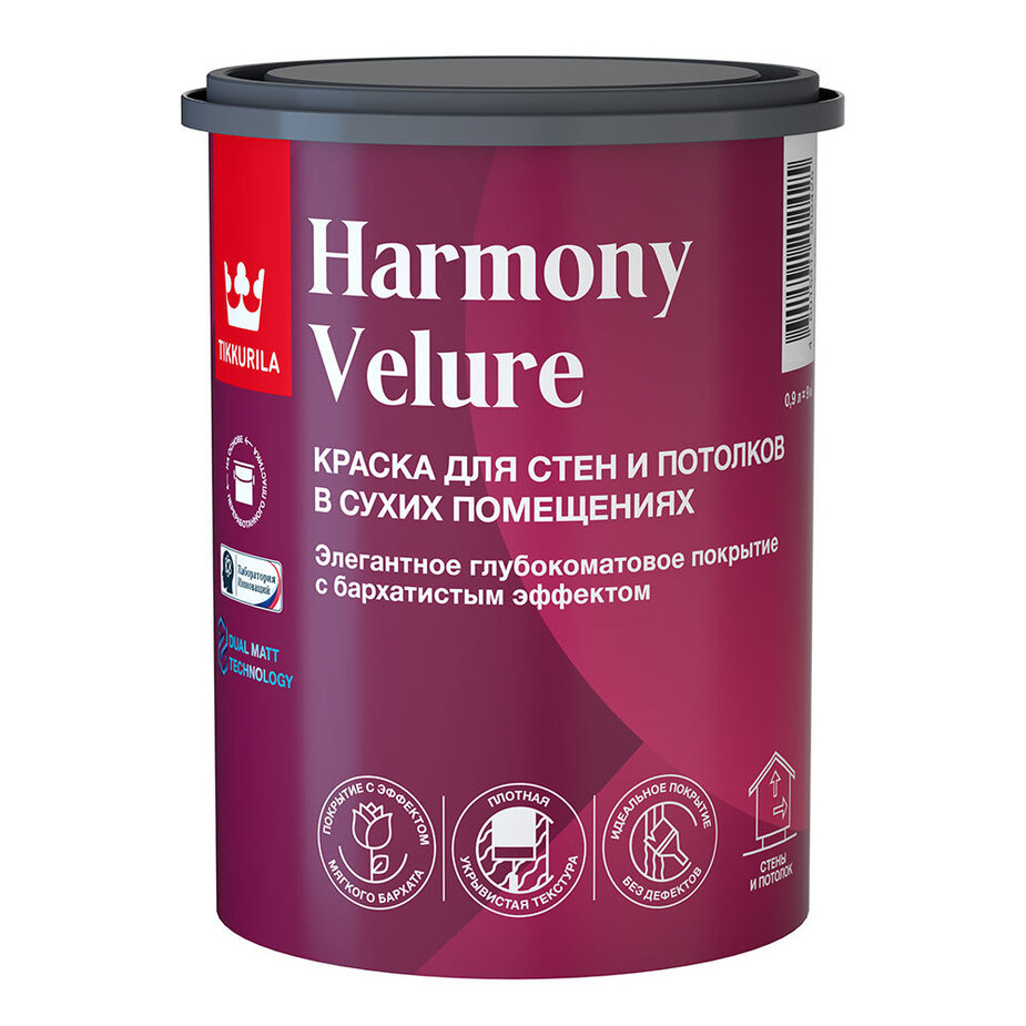 **Краска моющаяся элегантная Tikkurila Harmony Velure** предназначена для окраски новых и ранее окрашенных оштукатуренных, бетонных, зашпатлеванных, кирпичных, деревянных и гипсокартонных поверхностей, а также древесностружечных и древесноволокнистых плит внутри помещений, в т.ч. в детских дошкольных, учебных, лечебно-профилактических учреждениях и других помещениях с предусмотренным режимом влажной дезинфекции. Не подходит для окраски дверей и мебели.