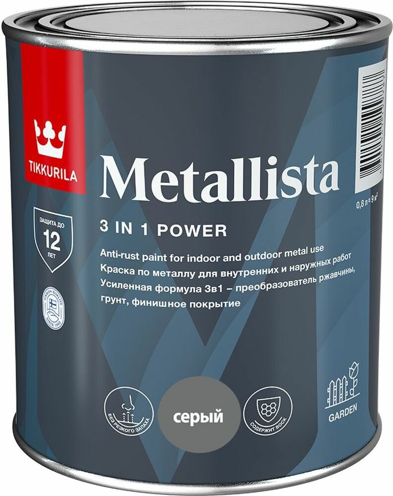 **Краска по ржавчине Tikkurila Metallista** - специальная атмосферостойкая краска по ржавчине для внутренних и наружных работ, сочетает в себе свойства преобразователя ржавчины, антикоррозионной грунтовки и декоративного финишного покрытия. Предназначена для окраски стальных и чугунных поверхностей, садовой мебели, гаражей, оград, решеток и т.п. Позволяет легко проводить окраску металлических поверхностей без тщательной очистки от ржавчины и дополнительного использования грунтовки. Воск в составе материала создает барьер и защищает от проникновения влаги к металлу. Антикоррозионные компоненты краски взаимодействуют со ржавчиной и не дают ей распространяться дальше, надежно защищая металлическую поверхность на длительный срок. Отличная износостойкость.