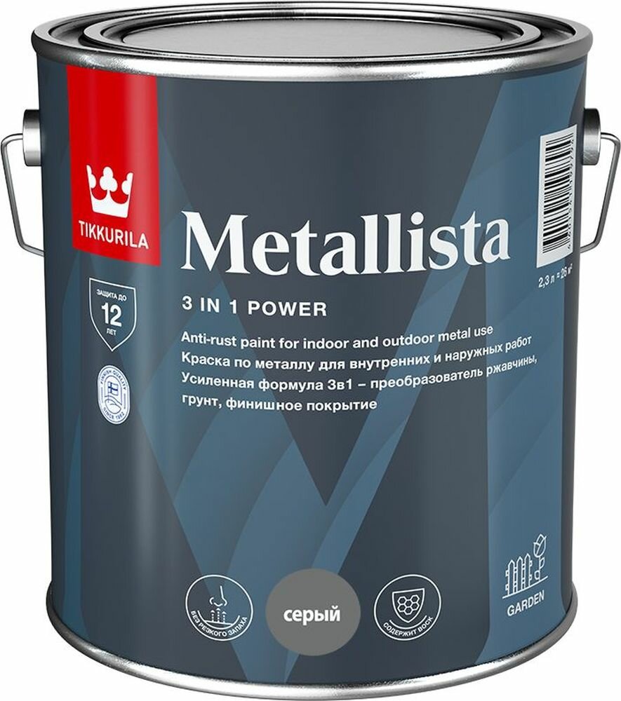 **Краска по ржавчине Tikkurila Metallista** - специальная атмосферостойкая краска по ржавчине для внутренних и наружных работ, сочетает в себе свойства преобразователя ржавчины, антикоррозионной грунтовки и декоративного финишного покрытия. Предназначена для окраски стальных и чугунных поверхностей, садовой мебели, гаражей, оград, решеток и т.п. Позволяет легко проводить окраску металлических поверхностей без тщательной очистки от ржавчины и дополнительного использования грунтовки. Воск в составе материала создает барьер и защищает от проникновения влаги к металлу. Антикоррозионные компоненты краски взаимодействуют со ржавчиной и не дают ей распространяться дальше, надежно защищая металлическую поверхность на длительный срок. Отличная износостойкость.