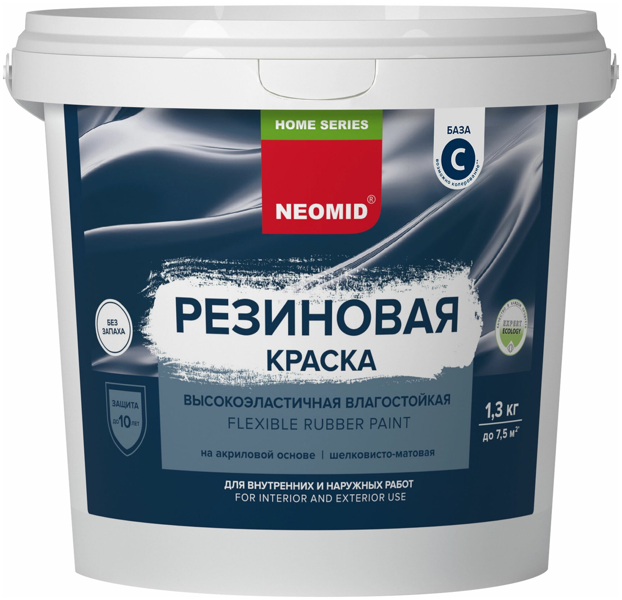 **Краска Neomid Home Series резиновая универсальная** предназначена для защитно-декоративной окраски крыш, водосточных систем, заборов, фасадов зданий, фундаментов, а также стен, потолков, декоративных элементов в помещениях сухих и повышенной влажности (кухни, ванные комнаты, подвалы).