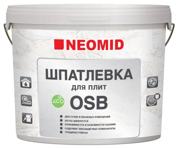 **Шпатлевка для плит OSB Neomid полимерная** – готовая к применению акриловая шпатлевка с армирующими волокнами предназначена для выравнивания и подготовки к финишной отделке поверхностей из OSB внутри и снаружи помещений. Образует прочное, атмосферостойкое покрытие.