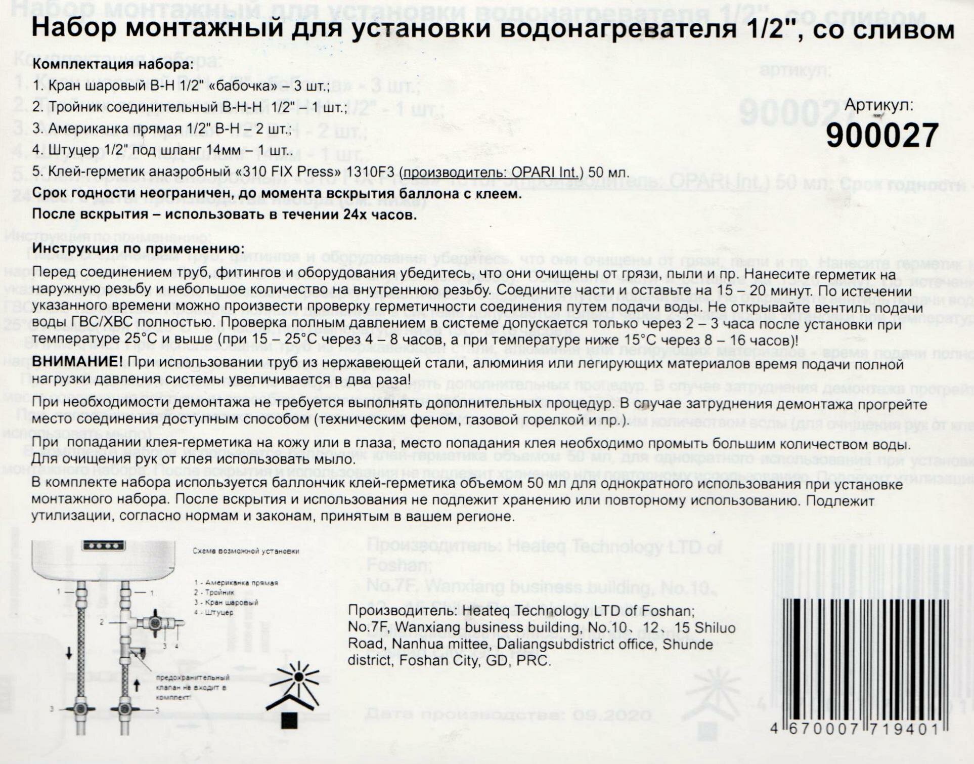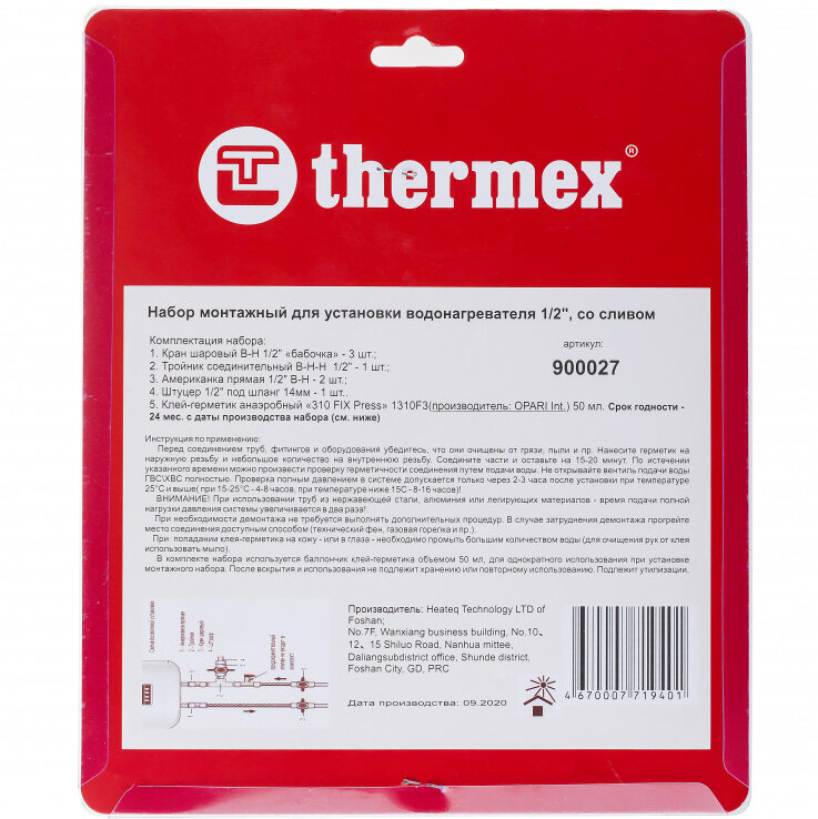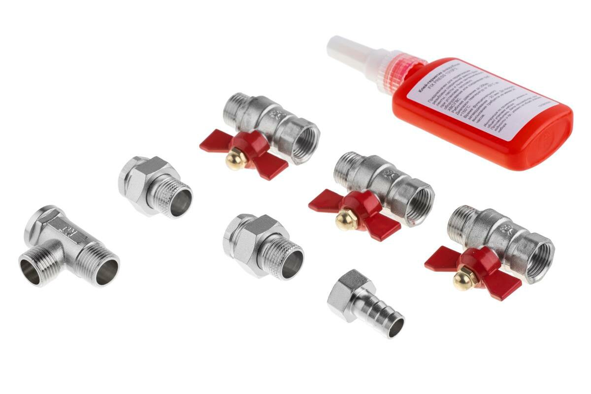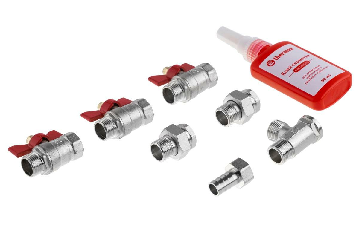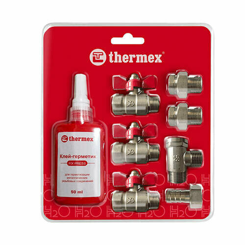 **Набор для монтажа водонагревателя Thermex** подходит для установки или ремонта всех проточных и накопительных водонагревателей с размером патрубков 1/2". Упрощает установку, монтаж и демонтаж устройств, обеспечивает возможность быстрого подключения водонагревателей в систему водоснабжения и отключение от нее. В состав входи анаэробный герметик, позволяющий герметично соединять элементы между собой.