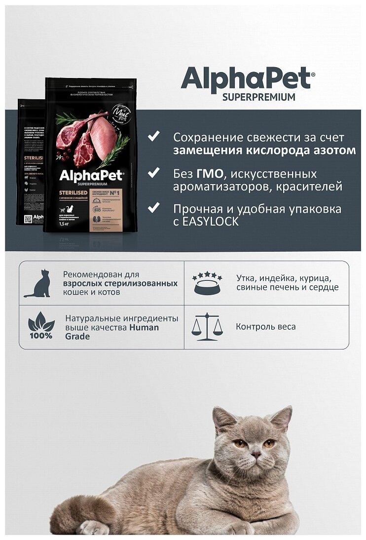 AlphaPet SUPERPREMIUM - суперпремиальное питание на основе натуральных ингредиентов. Линейка питания для животных, владельцы которых хотят быть уверены в лучшем выборе корма для своего питомца. Максимально открытый и понятный состав продукта, приготовленного по инновационной технологии из свежего мяса и с содержанием более чем 90% мясного белка!