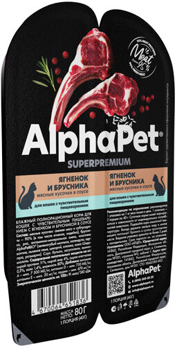 ALPHAPET Adult Sensitive Корм влаж.ягненокбрусника д/кошек с чувств.пищевар.лам.80г Корм для кошек, с чувствительным пищеварением, влажный корм, мясо, в соусе.