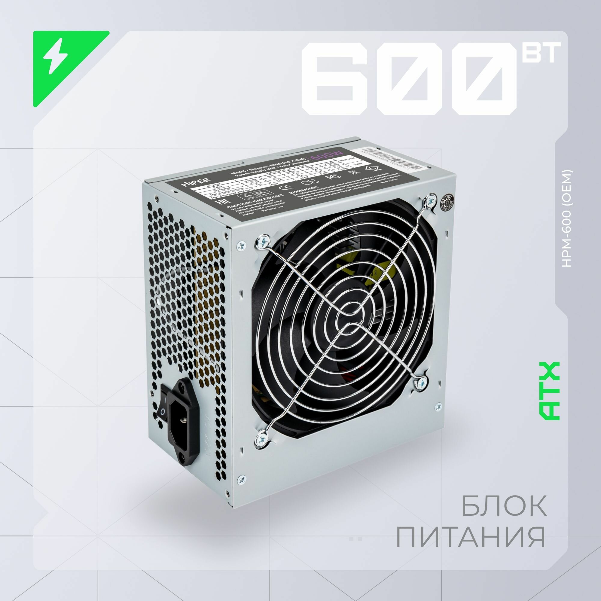 Блок питания Hiper HPM-600 серебристого цвета, ATX, мощность 600W PPFC, питание МП (20+4pin), питание видеокарты 6+2 pin, 4xSATA, размер вентилятора 120мм