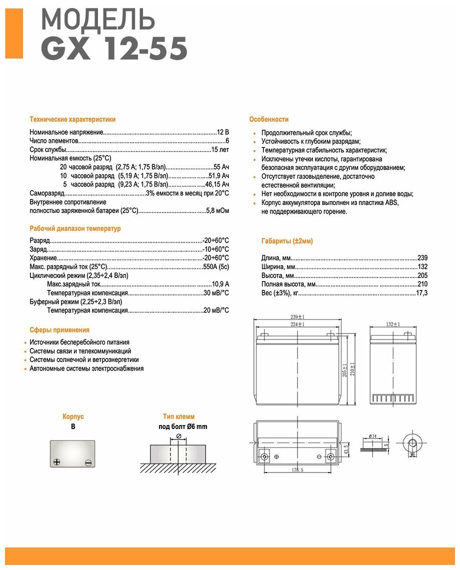 Мощные, надежные, промышленные гелевые аккумуляторы DELTA серии GX широкого профиля. Особенности и преимущества: продолжительный срок службы; устойчивость к глубоким разрядам; температурная стабильность характеристик; безопасная эксплуатация без утечки кислоты; отсутствует газовыделение, поэтому достаточно естественной вентиляции при эксплуатации; корпус аккумулятора выполнен из негорючего пластика. Сфера использования: электротранспорт и электроигрушки, сигнализации, бытовые и профессиональные электроинструменты, источники резервного бесперебойного питания ИБП (UPS) и другое электрооборудование. Отвечая международным стандартам безопасности и качества, аккумуляторы DELTA серии GX рекомендованы и для применения в охранно-пожарных системах, в системах видеонаблюдения, контроля и управления доступом серьезных госучреждений и коммерческих структур. Применяются также в системах связи и телекоммуникаций, в системах солнечной энергетики и ветроэнергетики. Срок службы до 15 лет.