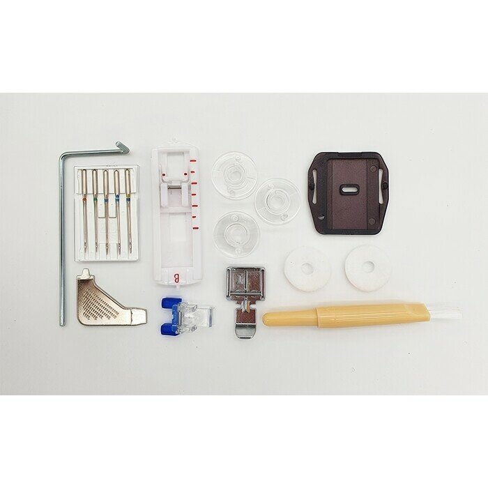 | Дополнительная комплектация | комплект игл (5 шт.), шпулька (4 шт.), педаль, отвертка, щеточка, катушкодержатель, фетровая прокладка, инструкция, стержень для катушки, направляющая для квилтинга, вспарыватель, рамка для полуавтоматической петли, штопальная пластина |
