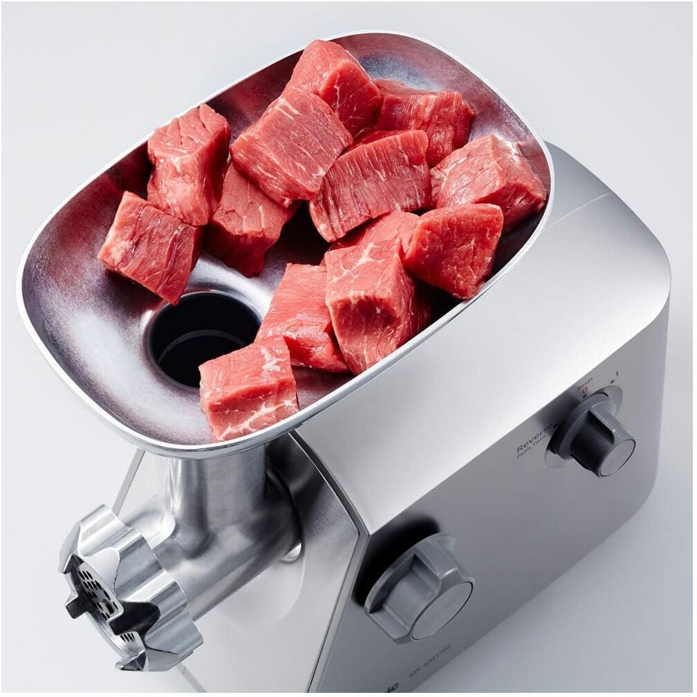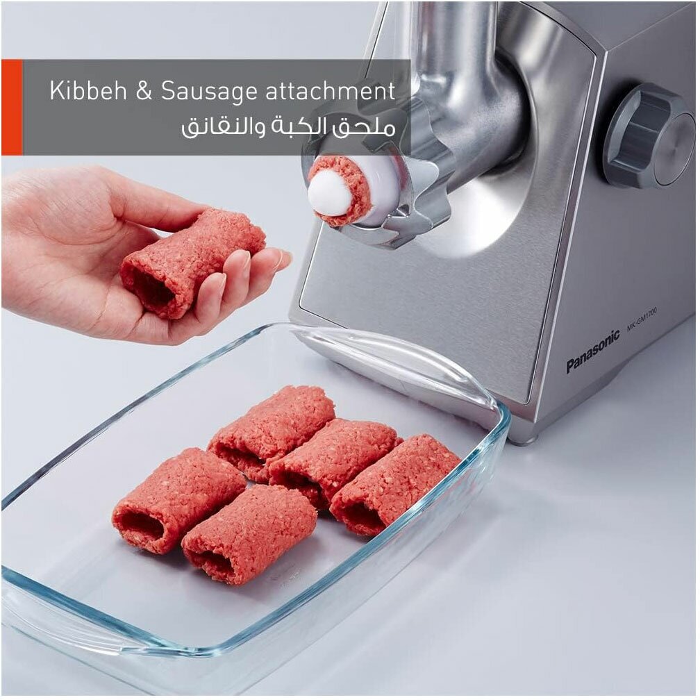 Электрическая мясорубка Panasonic MK GM 1700 Оснащена бесшумным высокопроизводительным двигателем мощностью 1700 Вт и лезвиями из нержавеющей стали, которые точно режут и измельчают мясо. Эта электрическая мясорубка имеет 2 режима скорости и режим реверса. Поставляется с универсальными насадками и сменными режущими пластинами, чтобы соответствовать стилю приготовления пищи. Включает чистящую щетку и шпатель для гигиенических целей. Для удобства добавлены переключатель включения/выключения и функция реверса, а также прочный металлический бункер.