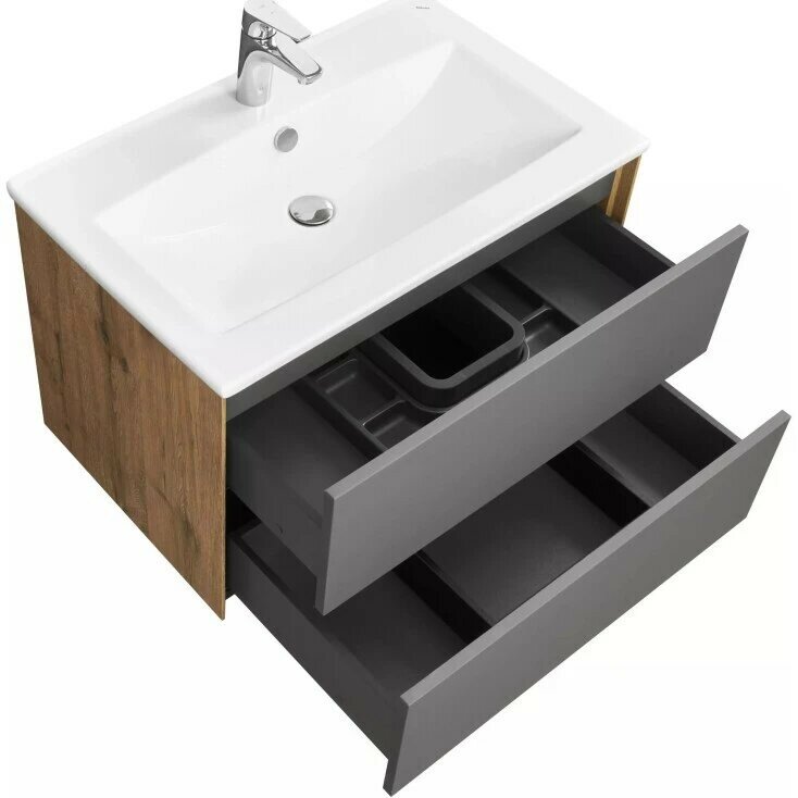 Комплект: - Тумба с раковиной Акватон Сохо 75 1A258101AJA00 дуб веллингтон/графит софт - Раковина Santek Элина 75 1WH501619 Характеристики: - Цвет: дуб веллингтон, графит софт - Материал корпуса: влагостойкое ЛДСП - Материал фасада: МДФ - Габариты (ШхВхГ): 734x472x45 мм - Монтаж: подвесной - Материал раковины: санфарфор - Размер раковины: 75 x 47 x 16.5 см - Тумба состоит из двух вместительных ящиков, оснащенных системой push-to-open, обеспечивающей надежное, комфортное и бесшумное закрывание - Верхний и нижний ящики оснащены системой организации пространства, которая позволяет содержать косметические средства в идеальном порядке