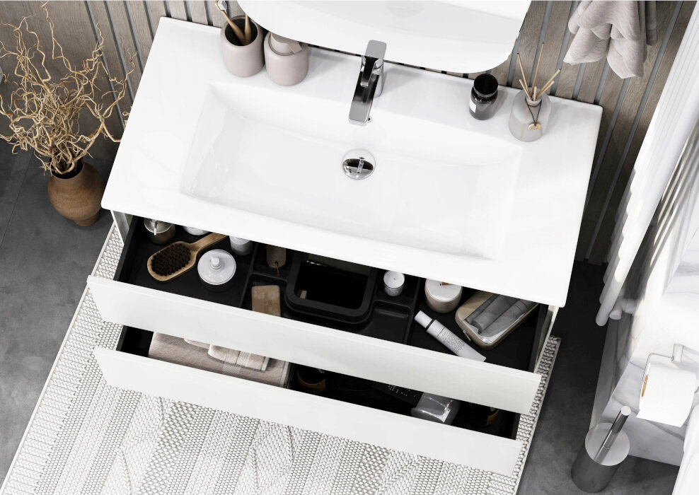 Тумба Сохо 100 функционально состоит из двух вместительных ящиков, оснащенных системой push to open, обеспечивающей надежное, комфортное и бесшумное закрывание. Фасады изделия выполнены из МДФ в белой глянцевой покраске, корпус из ламинированной влагостойкой ДСП в покраске белый глянец. Верхний и нижний ящики оснащены системой организации пространства, которая позволяет содержать косметические средства в идеальном порядке. Дополняет тумбу стильная раковина Элина от бренда Santek с удобной чашей. Все внутренние детали тумбы выполнены в цвете антрацит.