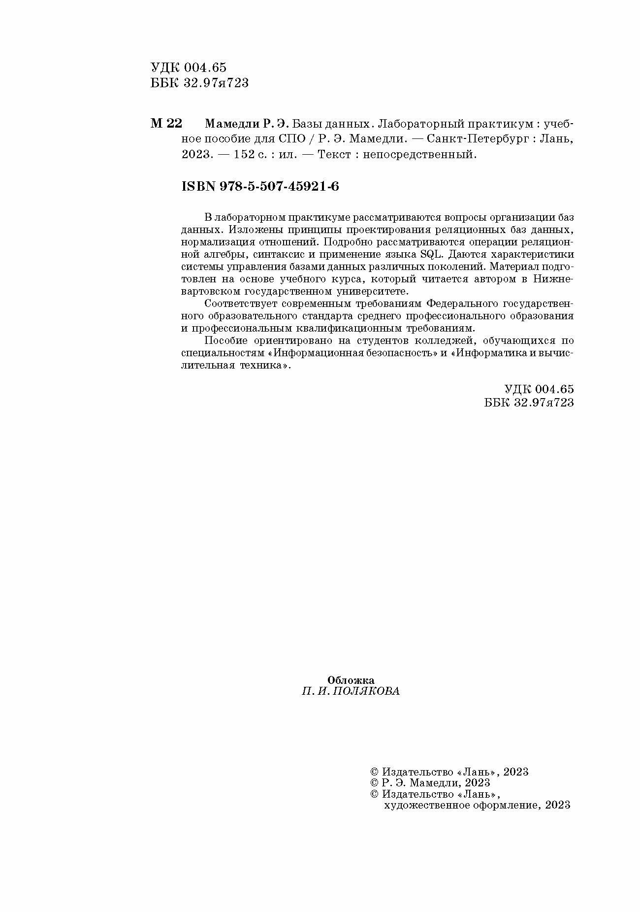 Базы данных. Лабораторный практикум (Р. Э. Мамедли); Издательство ЛАНЬ, 2023